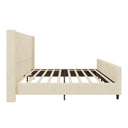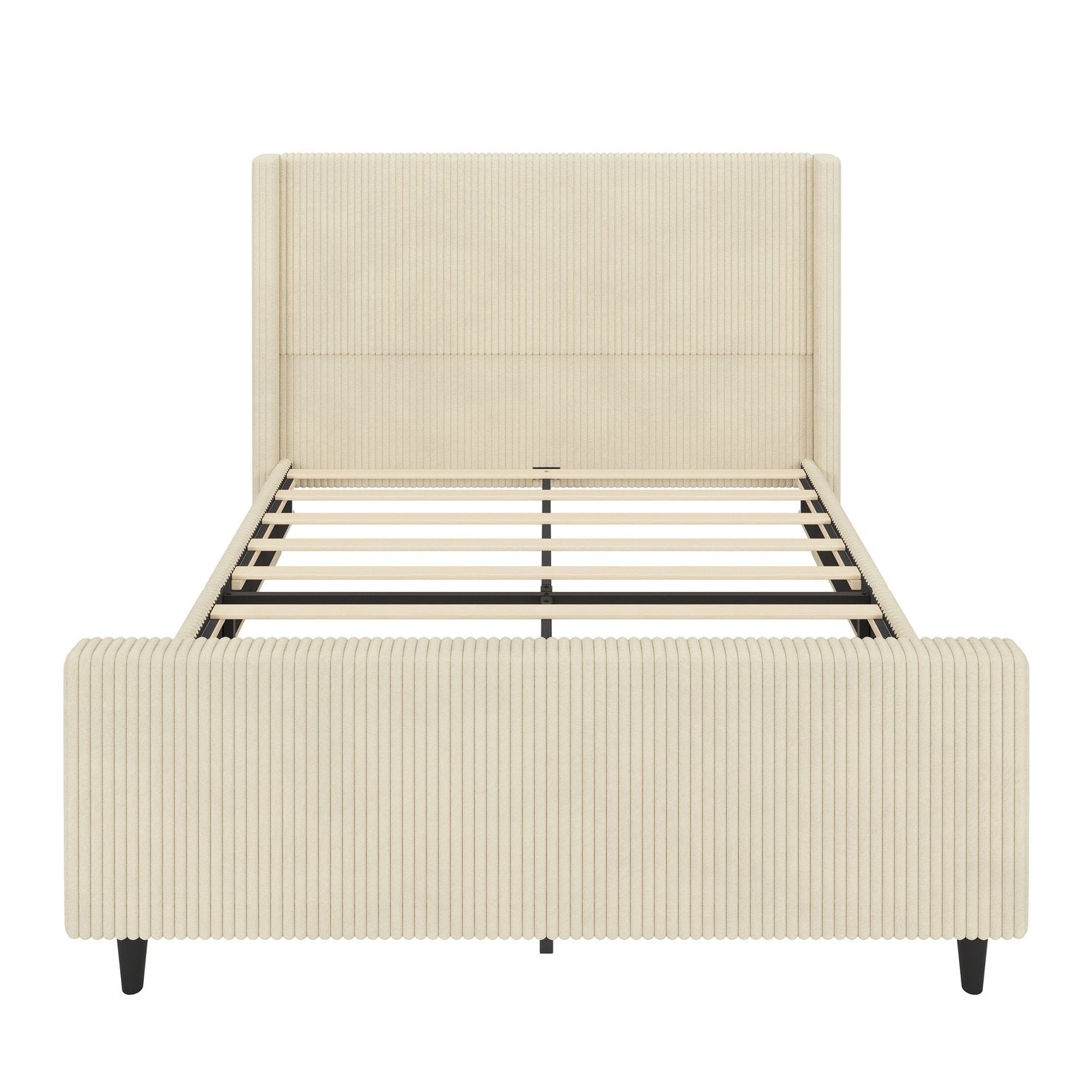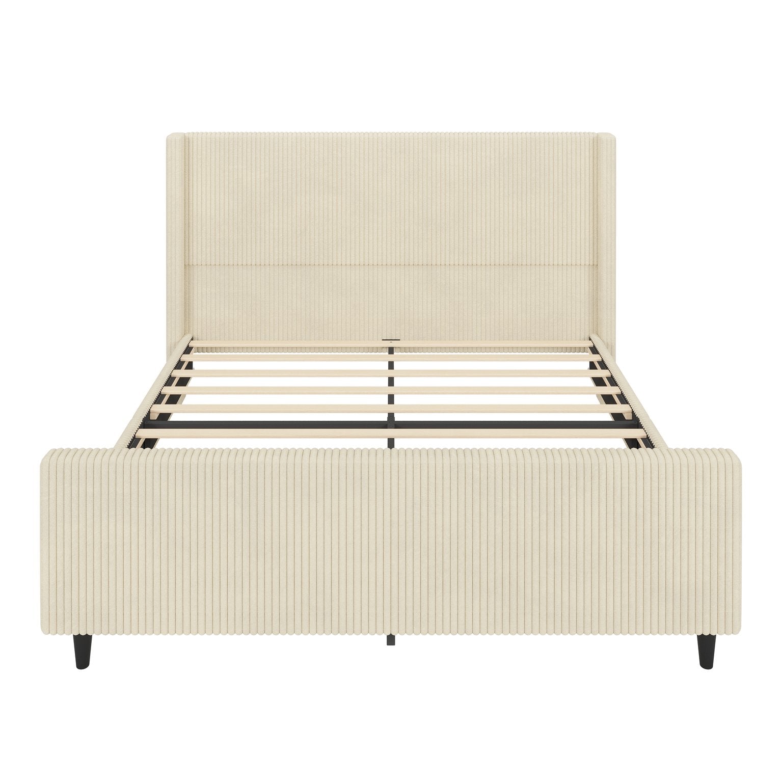 Transform your bedroom into a cozy, elegant retreat with this cream corduroy upholstered queen bed. The high, 50.7" headboard features a vertical stripe wingback design that adds visual height and a touch of classic sophistication, while the matching high footboard and sturdy platform eliminate the need for a box spring. Soft corduroy upholstery and a solid MDF/metal frame combine comfort with durable support for everyday use.