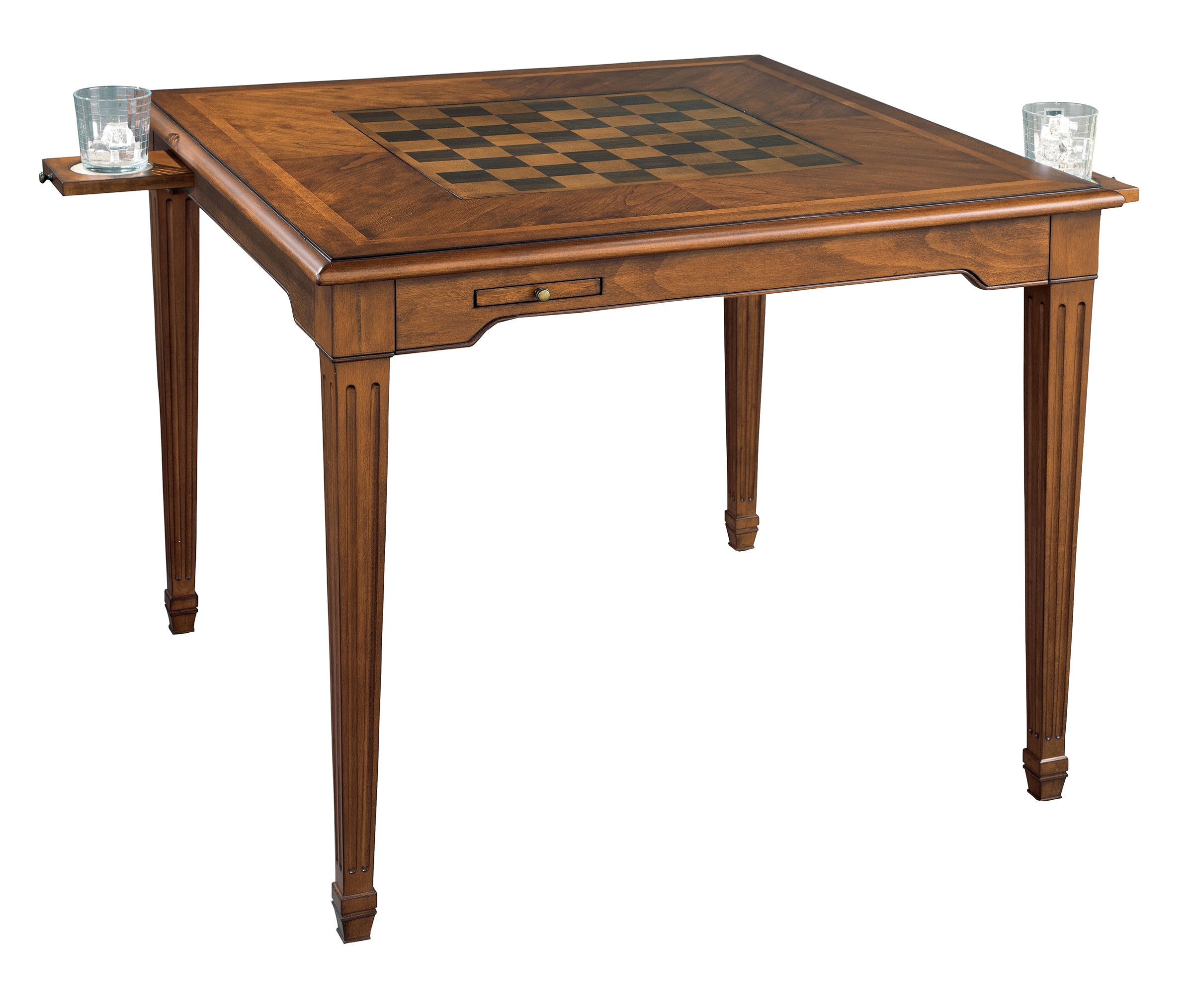 - Cherry inset top is removable, and features a maple, walnut and cherry inlaid chess board on the reverse side.