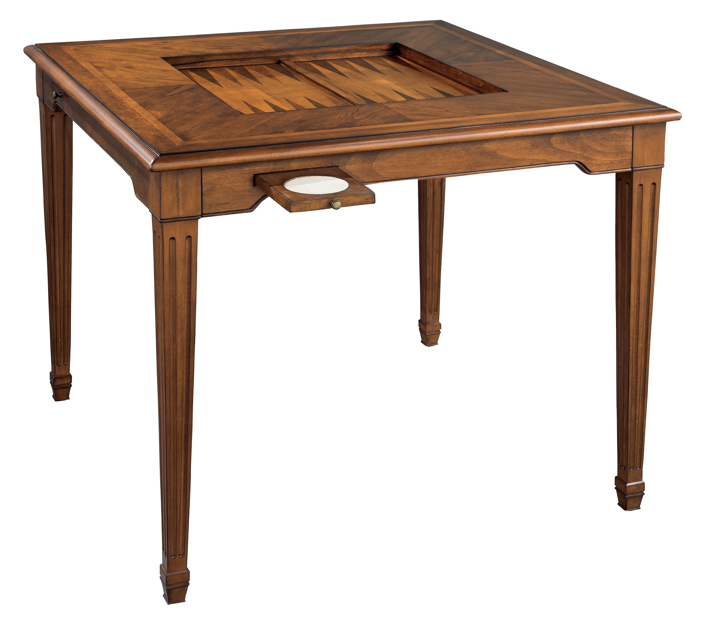 - Backgammon board with cherry, maple and walnut inlays is revealed beneath the center top.