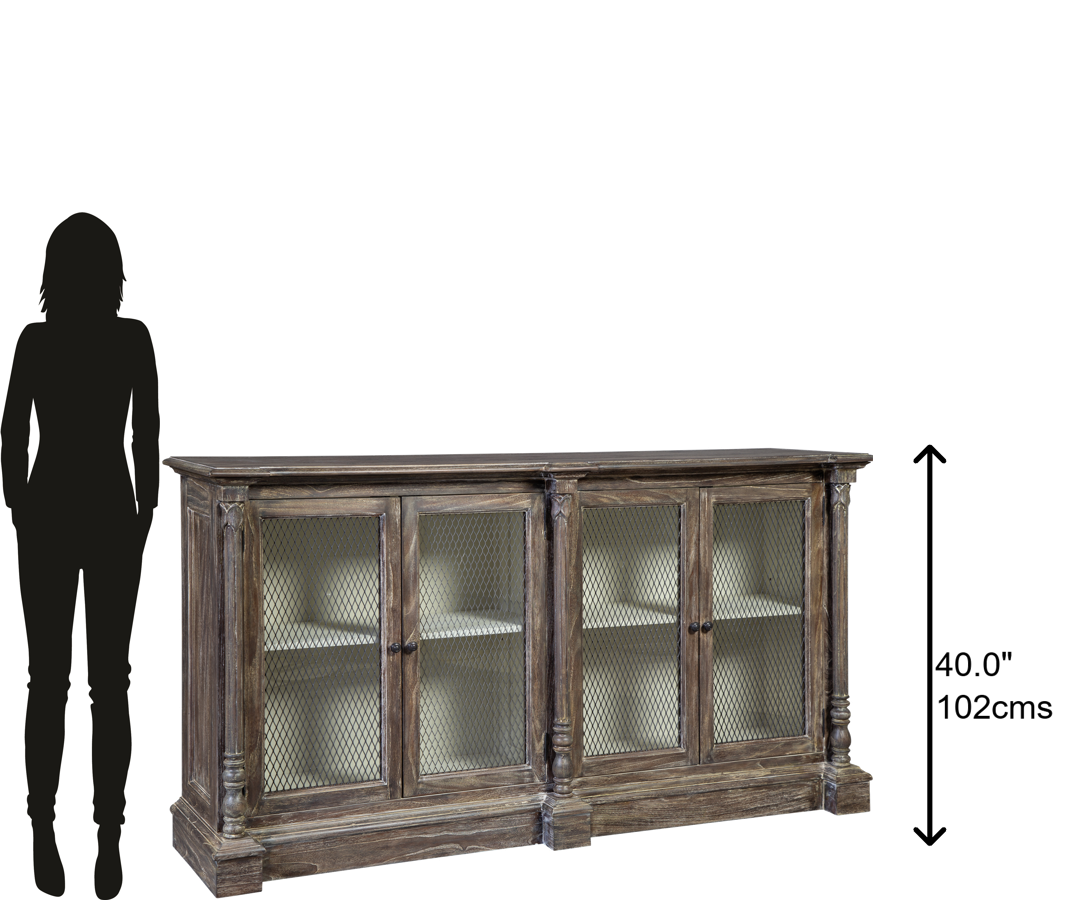 - Buffet with wire doors of mindi wood features generous breakfront posts at the center and ends.