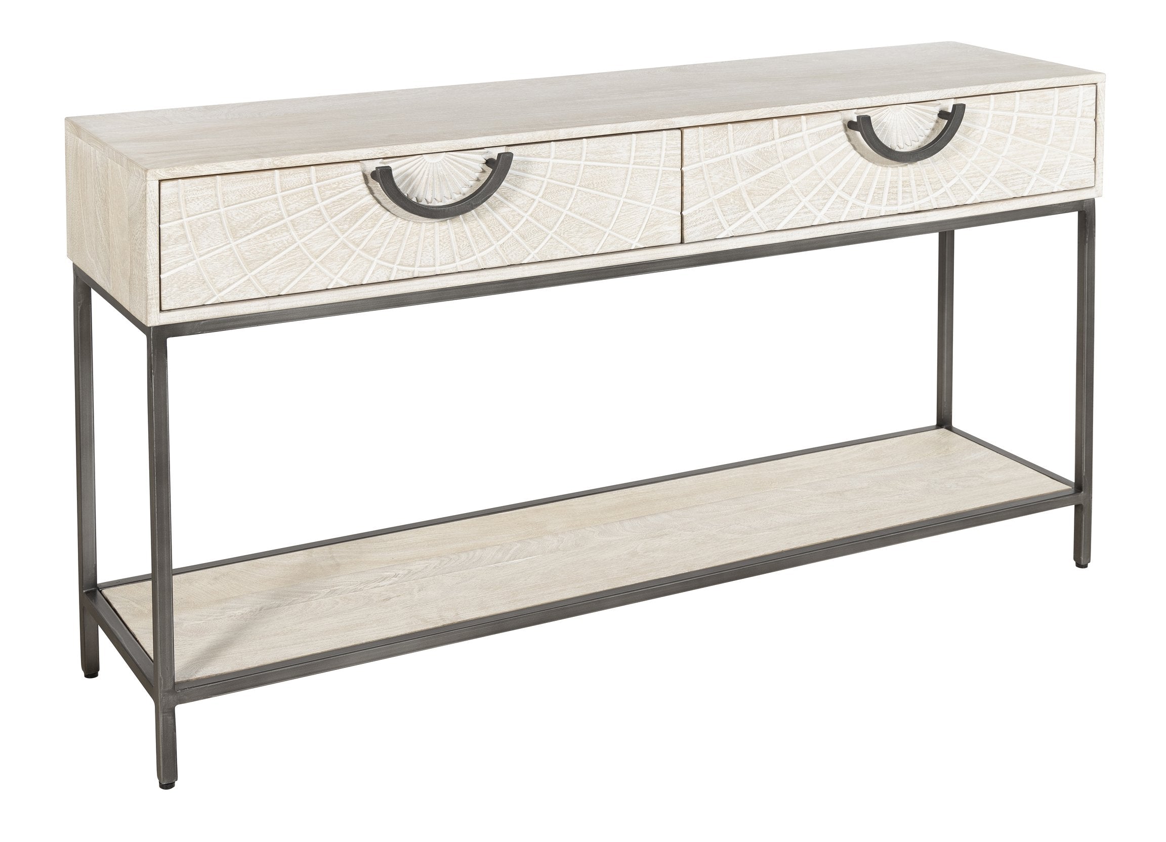 - Drawers have the sunburst design carved into both drawer faces.