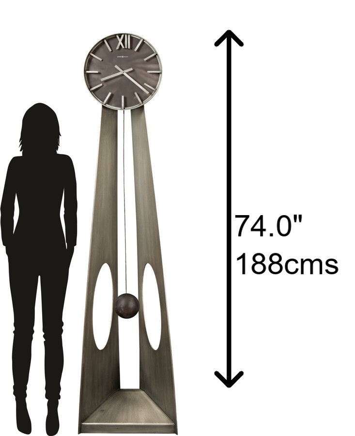 - s a sense of futuristic appeal here, what with the clean, undulating curves and smoothly machined metal. Timely Details: More than just a work of art, this metal clock offers endless functionality thanks to its northern dial. The component is finished in machined steel with a blackened tone and offers suspended hour markers and a Roman numeral at the 12 position. Finished in silver, it stands starkly against the backdrop, as do the matching aged silver hour and minute hands. Completing the design is a ball pendulum finished in charcoal black that swings through purposeful elliptical openings on the sides. Quartz Movement: Quartz movement requires one AA and two C batteries. Howard Miller: Founded in 1926 and still family-owned in its third generation, Howard Miller is the world&rsquo