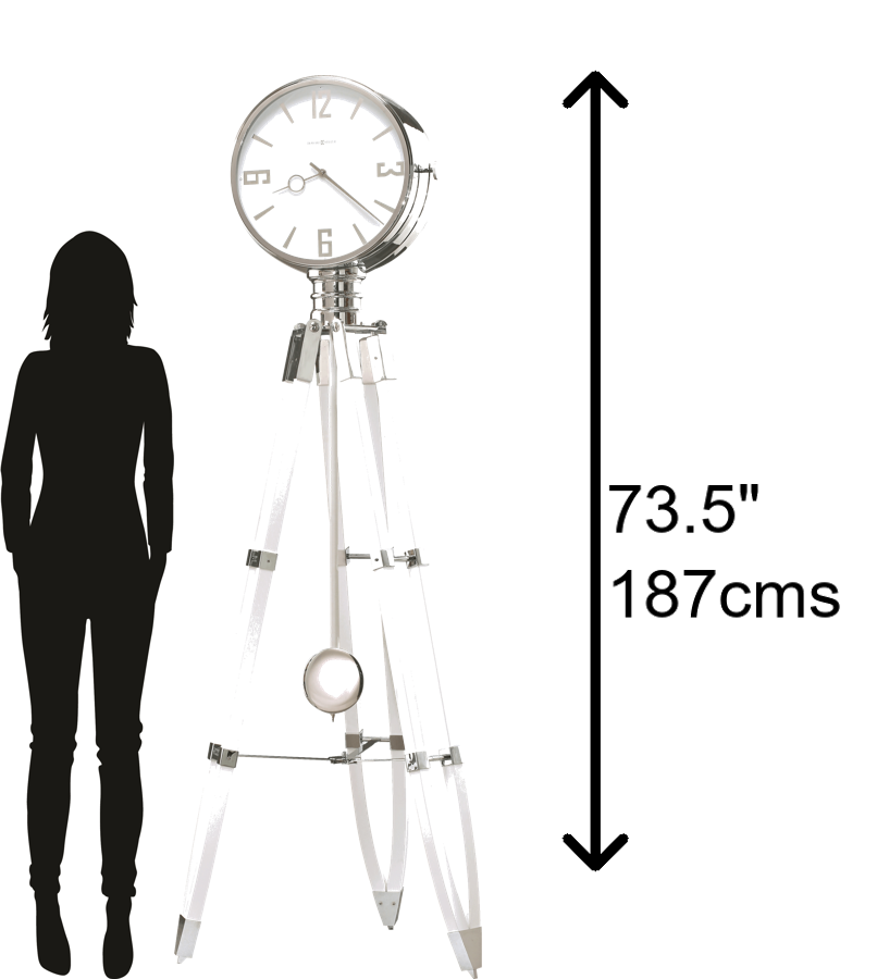 - Perfect for anywhere between your living room and the bedroom of an adventurous child, the Chaplin III tripod grandfather clock is just the statement piece your room is looking for. Functionality: This tripod clock can play your choice of full Westminster or Ave Maria chimes with strike on the hour with 1/4, 1/2, and 3/4 chimes accordingly, Westminster chime and strike on the hour only, or Bim Bam chime on the hour only. It also features volume control and an automatic nighttime chime shutoff option to make sure your sleep is uninterrupted. Style: This grandfather clock screams retro vibes thanks to its high-gloss white on select hardwoods and veneers along with polished, chrome-finished metal accents and a stationary white dial with chrome-finished Arabic numerals, hour markers, and hands. The polished, chrome-finished pendulum bob is suspended on a white high-gloss finished wooden stick that creates a linear design from top to bottom. Quartz Movement: This tripod grandfather clock has quartz, triple-chime Harmonic movement and requires two C and two D sized batteries. Howard Miller: Founded in 1926 and still family-owned in its third generation, Howard Miller is the world&rsquo