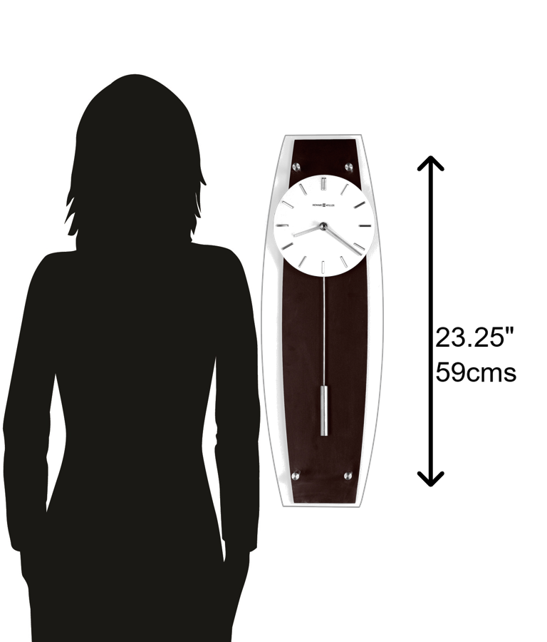 - WALL CLOCK: The Cyrus Wall Clock features a Wenge look and black coffee-finished back panel with polish nickel-finished accents to compliment your home decor. The cylindrical pendulum makes a soft ticking noise without the use of chimes for a quieter environment. DURABLE: This indoor modern clock is created to last. It has a sturdy frame to relieve stress in a busy household. Display it in your kitchen, office, bathroom, bedroom, living room, and more. HIGH QUALITY: The contemporary wall clock will quickly become a home essential. Easily tell time with the nickel-finished, raised hour markers and straight hands to stand out over the white dial with flat glass that covers the entire front. MOVEMENT: It is powered by quartz movement and requires one AA sized battery. HOWARD MILLER: Founded in 1926 and still family-owned in its third generation, Howard Miller is the world&rsquo