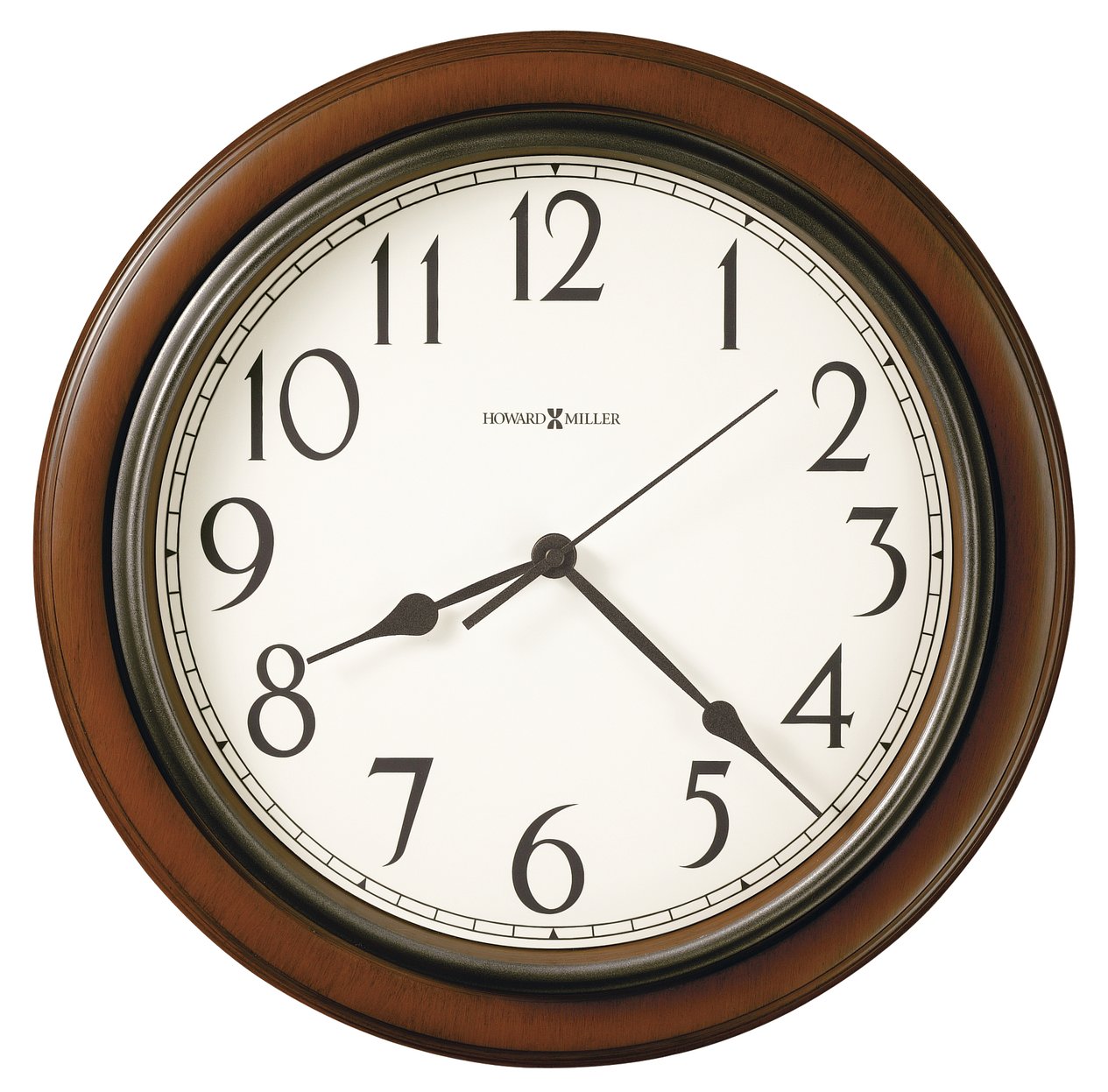- s quartz movement makes a soft ticking noise without the use of chimes for a quieter environment. DURABLE: This indoor modern clock is created to last. It has a sturdy frame to relieve stress in a busy household. Display it in your kitchen, office, bathroom, bedroom, living room, and more. HIGH QUALITY: The rustic, circle design will ensure you can read the time anywhere in the room. Easily tell time with the large, charcoal gray Arabic numerals, spade hands, and glass crystal to stand out over an off-white dial. MOVEMENT: It is powered by a quartz movement and requires one AA sized battery. HOWARD MILLER: Founded in 1926 and still family-owned in its third generation, Howard Miller is the world&rsquo