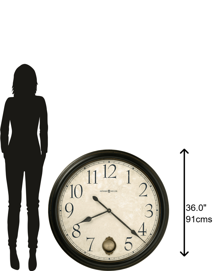 - Add a touch of classic design with this Howard Miller round wall clock. With beautiful antique styling and a stunningly detailed design, this clock adds a decorative touch to any room. Unique Finish: This oversized wall clock is finished in black satin with worn edges. The careful craftsmanship of the clock paired with premium materials creates a timeless piece that will offer added style to your home for years to come. Detailed Design: No detail was forgotten in the creation of this stunning antique wall clock. An aged dial with crackle background, aged black Arabic numerals, and aged black spade hands all come together to create an antique styling for this piece. Pair with other vintage decorations to create a wholly unique look. Antique Styling: A beautiful pendulum window at the "