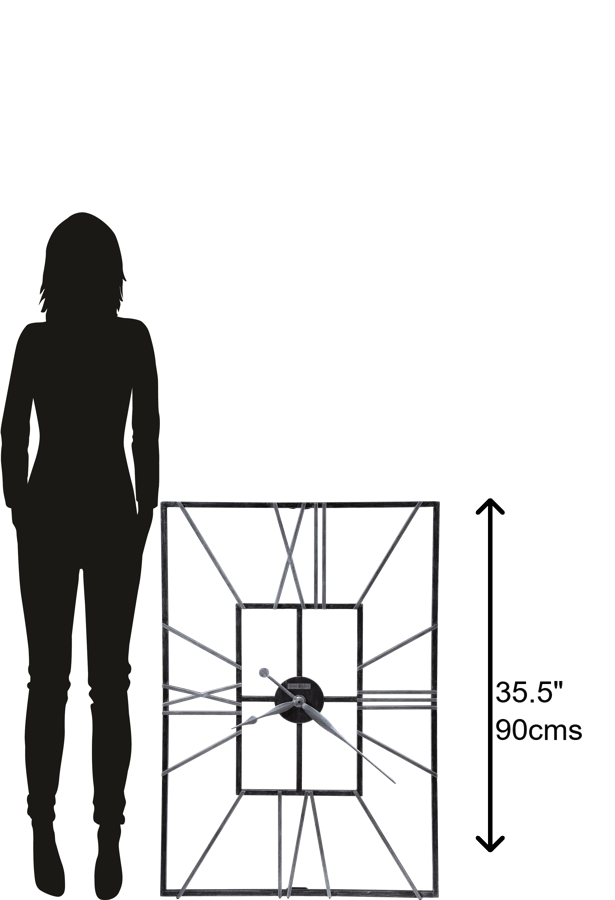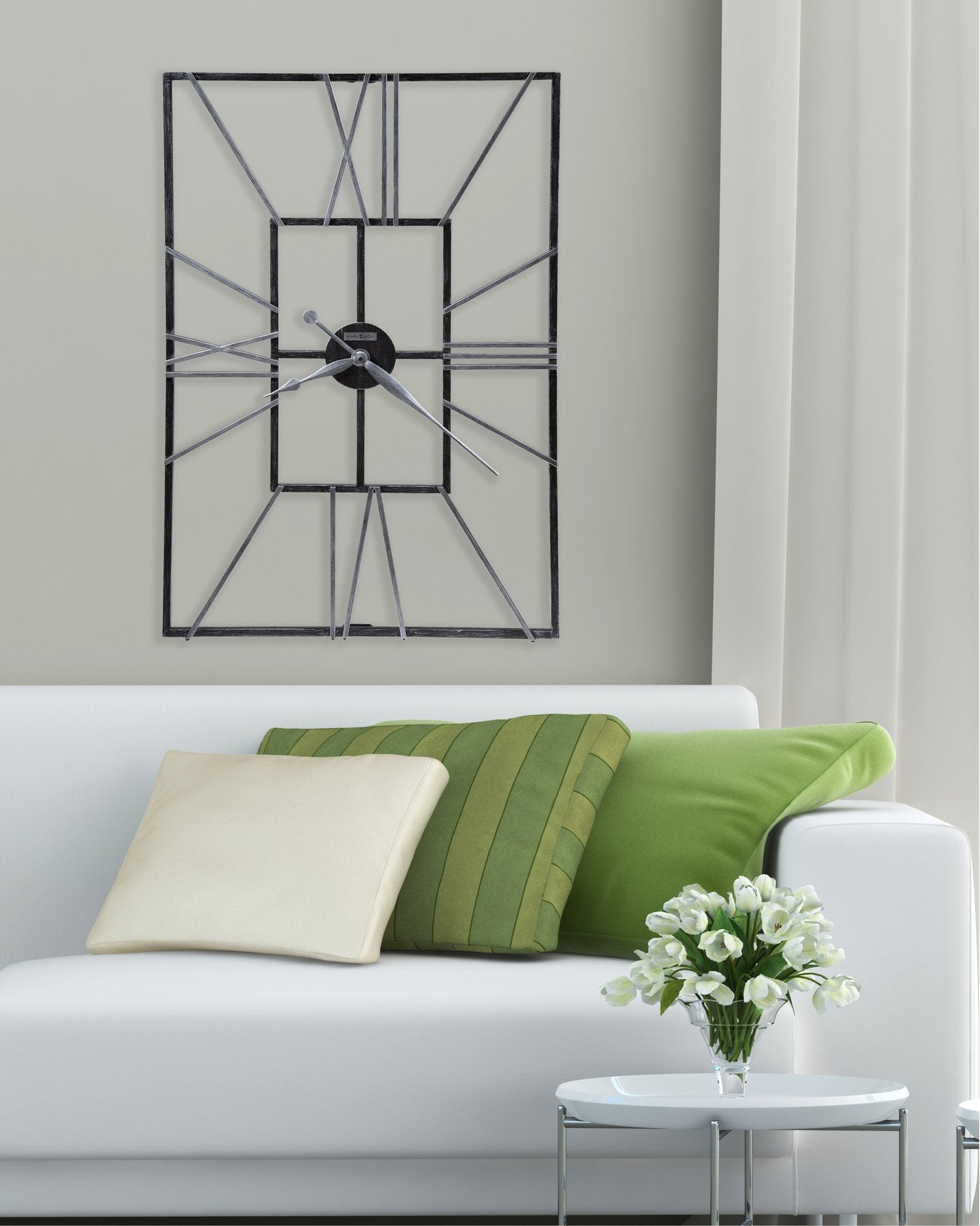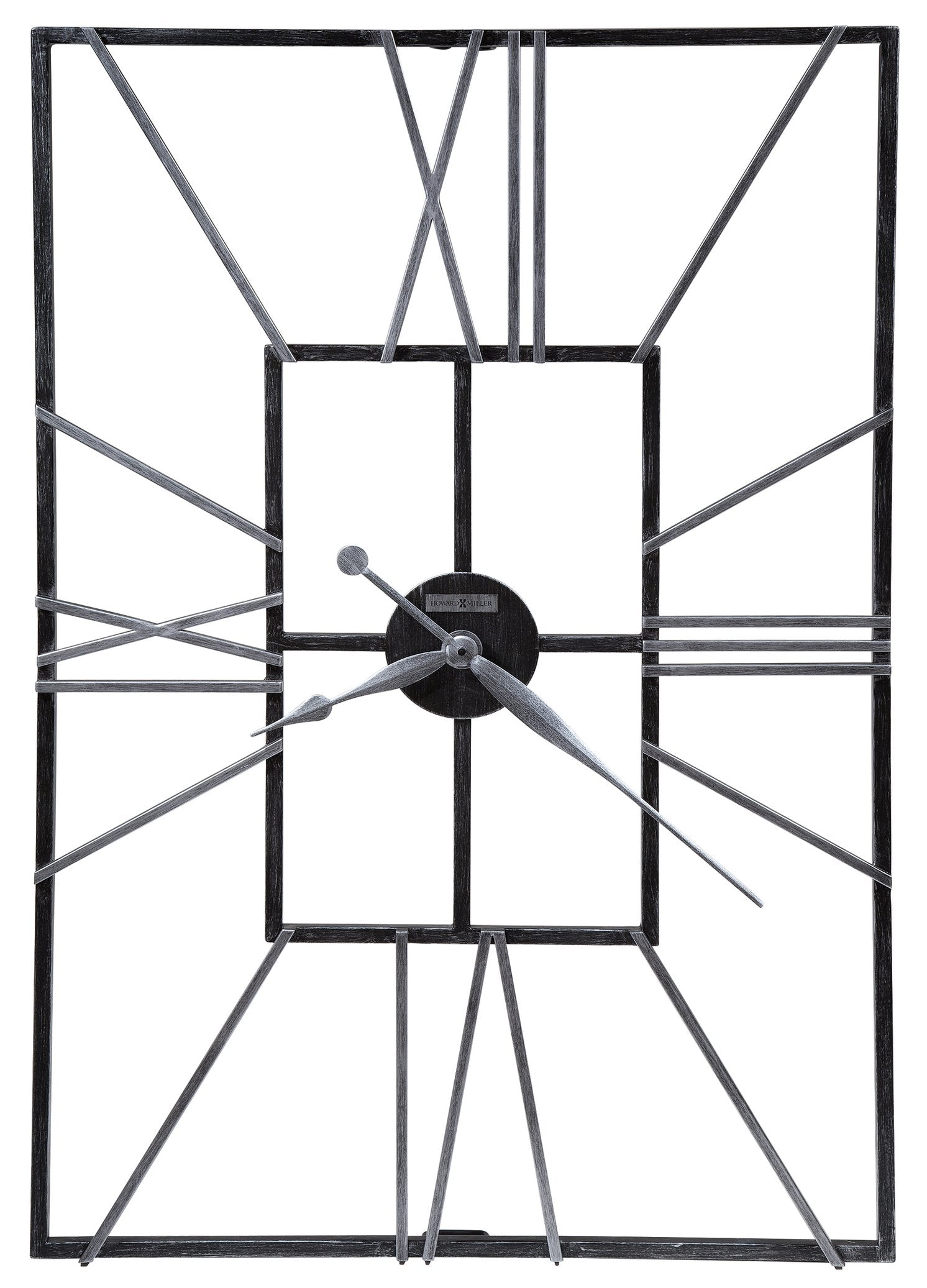 - s no explanation required. A splendidly oversized silhouette lends this accessory strength, purpose, and character. Its clean lines and minimal colors evoke a futuristic spirit, making it a sensible addition to the modern home or workplace. The openwork design allows the back wall to stand out, creating an interesting visual that will finish any living room, sitting room, bedroom, or office perfectly. All in the Details: Beautifully conceived with sturdy wrought iron, this attention-grabbing rectangular clock proves contemporary style is anything but cold and unapproachable. This bold piece brings to life the aesthetic in a remarkable way, utilizing color and shape to create a work of art. Its charcoal frame provides support for the aged Roman numerals and minute and hour markers, all finished in aged nickel for strong contrast. Quartz Movement: Quartz, battery-operated movement requires 1 AA battery (not included). Howard Miller: Founded in 1926 and still family-owned in its third generation, Howard Miller is the world&rsquo
