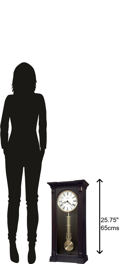 - This hardwood wall clock comes complete with a classic swinging pendulum and is sure to add a touch of class to any room. With beautiful hardwoods and detailed features, the Mia is a stunning design piece as well as a practical time telling component. Select Hardwoods: Finished in worn black with red and brown undertones on select hardwoods and veneers, this handsome hardwood wall clock features fluted columns with raised beveled column caps and flat glass that encases the dial. The look is completed with a brushed antique brass-finished pendulum bob with brass-finished harp and lyre. Roman Numerals: Pairing with the classic styling, the clock features an aged dial with aged black Roman numerals, black serpentine hands, and a brushed antique-brass finished bezel. Quartz Movement: The quartz, single-chime movement plays a Westminster chime on the hour and counts the hour. Additionally, this unique clock features an automatic nighttime chime shut-off and requires four AA sized batteries for operation. Howard Miller: Founded in 1926 and still family-owned in its third generation, Howard Miller is the world&rsquo