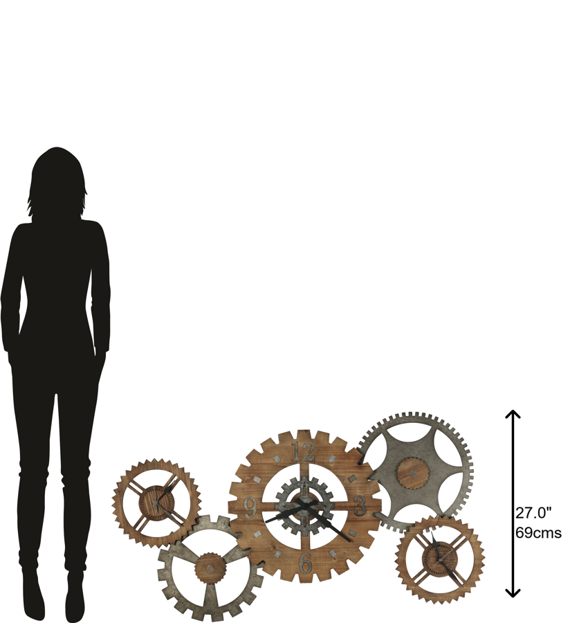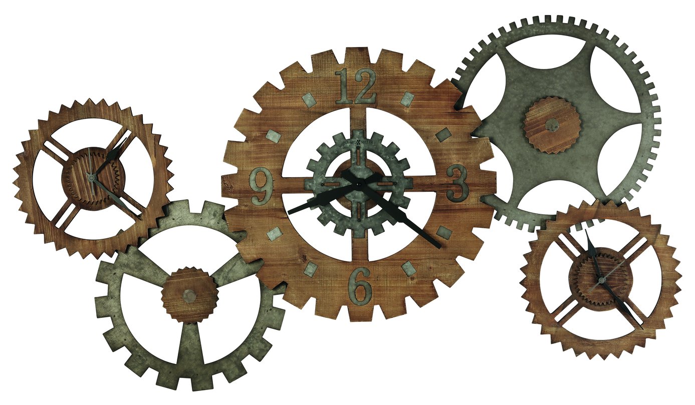 - Accent your living room with the Cogwheel III oversized wall clock from Howard Miller. Three of its five gears function as clocks, and it has an aged finish to impart the look of a well-worn antique. The generous 49-inch width of this timepiece makes it a good accent for any size room. Antique Industrial Style: This wooden wall clock has metal accents and an antique finish to bring rugged beauty to your home. The combination of aged galvanized steel and wood goes with almost any furnishings. Three Clocks in One: Three of the five gears comprising this large wall clock are functional dials, and they can be set to different times. Arabic numerals mark the 3, 6, 9, and 12 positions with hour markers in between. Black hands coordinate with the aged galvanized steel numerals for a coordinated look. Quartz Precision: This wooden wall clock has quartz, battery-powered movement. It requires three AA batteries. Howard Miller: Founded in 1926 and still family-owned in its third generation, Howard Miller is the world&rsquo