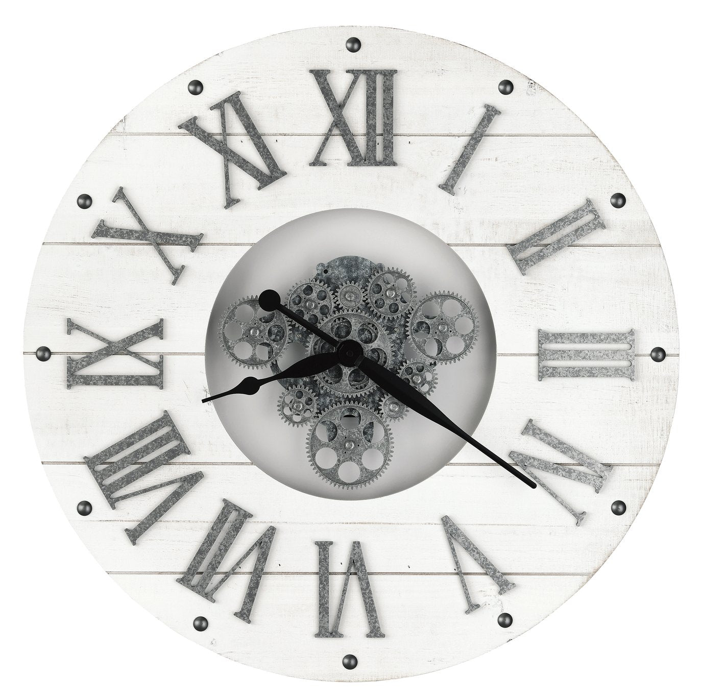 Clock Design: This large 27" wall clock with an open center is finished in antique white and grooved for a planked appearance. Behind the hour and minute hands are various moving, galvanized finished gears in different sizes that appear to be floating.