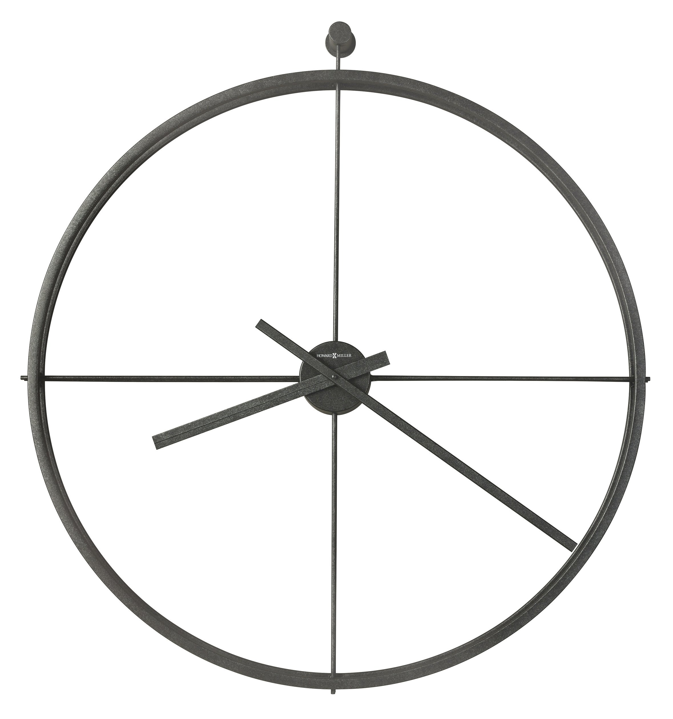 - This wall clock features an outer metal ring in a dark charcoal finish and four bars that connect the center dial to the outer ring at the 12, 3, 6, and 9 positions.