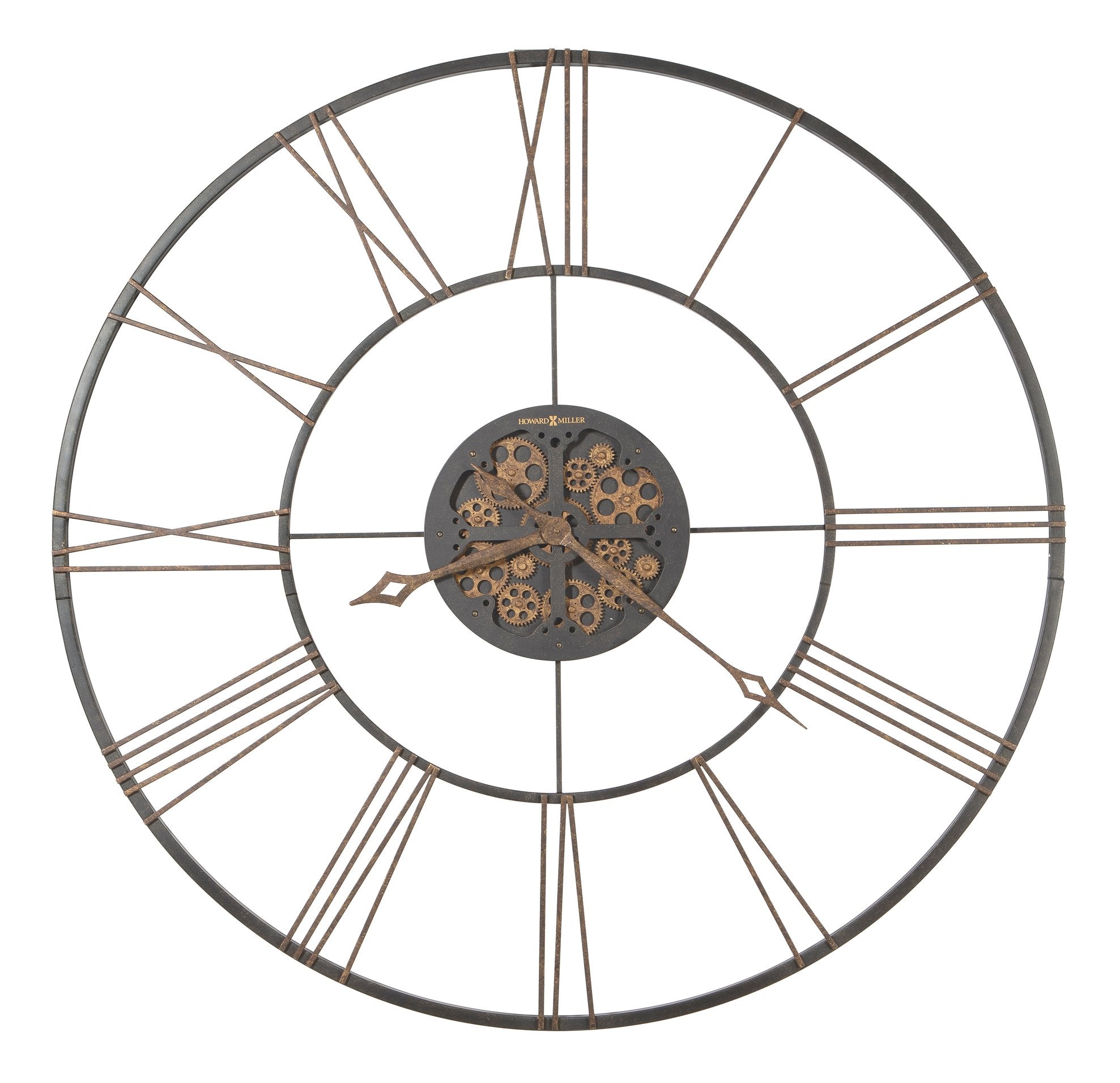 - Aged black finished frame with antique brass finished moving center gears