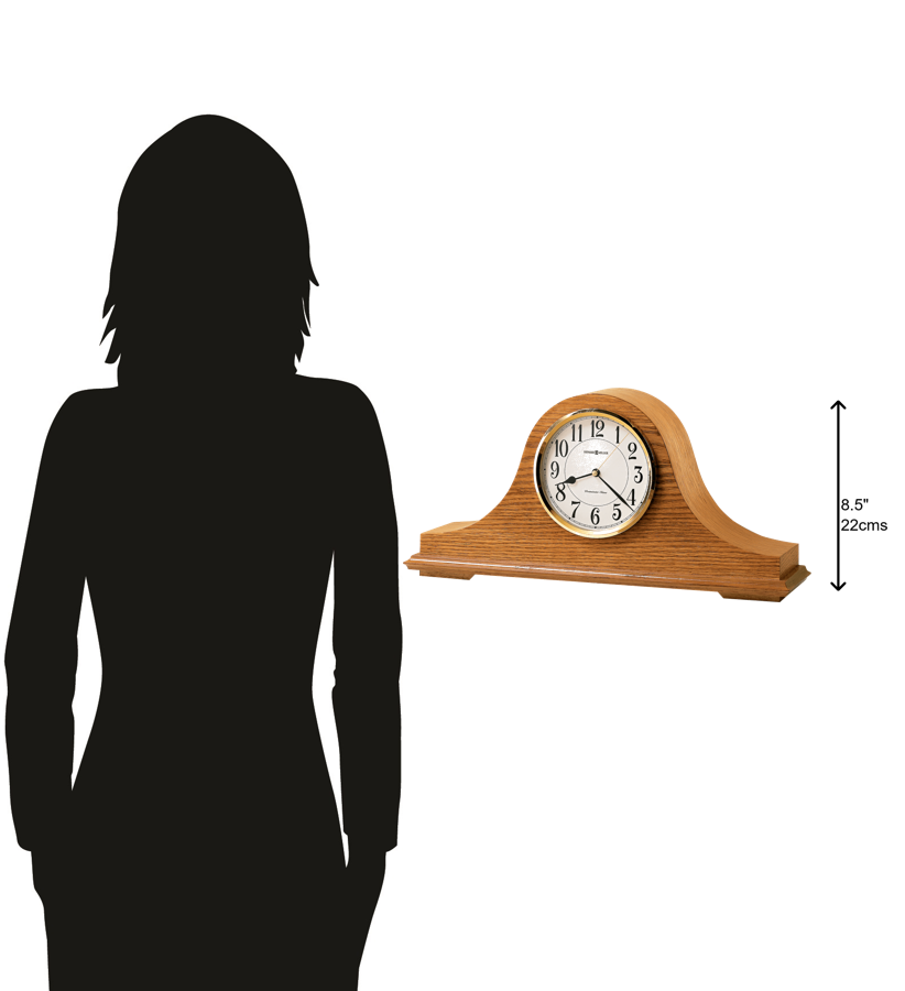 - MANTEL CLOCK: The Nicholas Mantel Clock features a Golden Oak finish on select hardwoods and veneers to complement your home decor. Place it above your fireplace in the living room for a classic decorative accent piece. DURABLE: This classic clock is made to last. It has a sturdy wood frame to relieve stress in a busy household. This timepiece has black numerals, brass second hand, a polished brass-finished bezel, and convex glass crystal to stand out on an off-white dial. CHIMES: Easily tell time with a single-chime movement that plays the Westminster chime to strike each hour. Set the automatic nighttime chime shut-off for convenient volume control to have anywhere in your house. MOVEMENT: It is powered by quartz movement, and requires three AA sized batteries. HOWARD MILLER: Founded in 1926 and still family-owned in its third generation, Howard Miller is the world&rsquo