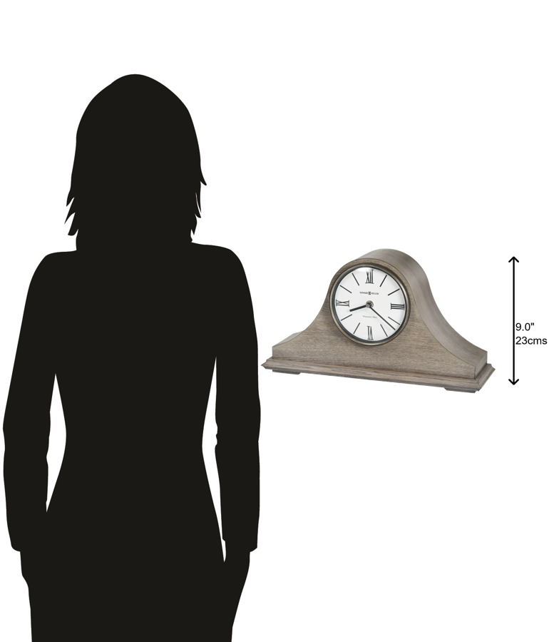 - The epitome of sophistication, this striking wooden mantel clock is destined to be an enduring favorite. Boasting a clean, flawless appearance, it evokes a sense of time-honored style. The versatile timepiece fits beautifully into both modern and transitional spaces, while its neutral tone lends it a warm, inviting quality. Perched on the mantel, it commands attention in the most subtle way. Perfect Form: This mantel clock features an ash-veneered tambour-style piece whose Seaside Grey hue makes a sensible substitute for customary blacks and browns. A crisp white dial is accented by black bar-style hour markers, along with Roman numerals positioned at the 3, 6, 9, and 12 marks. The design is completed with the black minute and hour hands, along with a bezel finished in complementary charcoal grey. A convex glass crystal safeguards the dial. Practical Details: This clock automatically shuts off between 10:01 pm and 5:59 am for your convenience. During the day, it plays the Westminster chime and counts every hour. Quartz Movement: Quartz/Westminster, battery-operated movement requires three AA batteries (not included). Howard Miller: Founded in 1926 and still family-owned in its third generation, Howard Miller is the world&rsquo