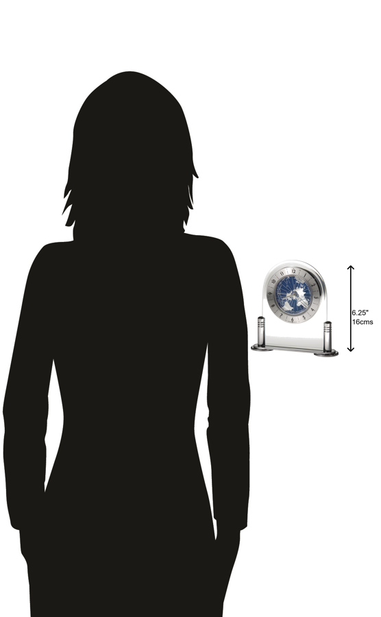 - s face and the careful styling of the piece makes it a truly unique table clock, perfect for any home. Careful Craftsmanship: As always, Howard Miller offers careful craftsmanship in the design of this world map clock. The revolving world map is accented with deep blue oceans and silver-tone continents, all protected by a convex acrylic crystal. The end result is a memorable piece that is equally as decorative as it is practical. Unique Design: No design detail was missed with this alarm clock. Polished silver-tone metal columns and a solid base support the beveled arch creating a beautiful and sleek design. Extra Features: There is no need to fret when placing this world map clock on any surface. A felt bottom protects fine desks and shelves from scratches. Quartz Movement: Utilizing quartz movement, this alarm clock requires one AA size battery. Howard Miller: Founded in 1926 and still family-owned in its third generation, Howard Miller is the world&rsquo