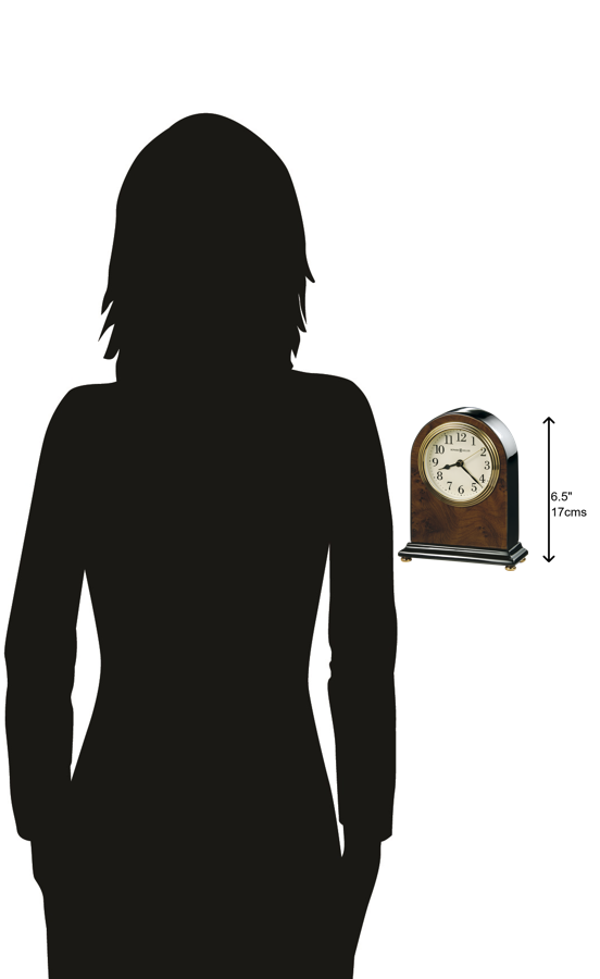 Discreet Depth: At a glance, this traditional table clock commands attention — yet it does so in a most subtle manner. The arched silhouette alone lends it beauty, while a wood burl pattern graces the front and back. The sides and base are finished in black for a complementary look, while polished brass button feet provide support at the bottom. The waterfall bezel on this wood table clock has a polished brass-tone finish, while the off-white dial features black Arabic numerals, black hour and minute hands, and a brass second hand. It’s all set behind a protective glass crystal.
