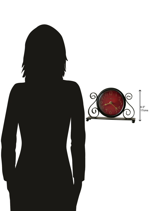 - With gorgeous scrolling iron features and a unique antique red face, the Howard Miller Marisa iron table clock is a decorative piece sure to spice up any room. Featuring careful craftsmanship, this clock offers far more than a way to tell time. Iron Table Clock: This bent-scroll iron table clock features a metal base and round ball style feet finished in charcoal black. Each feature has been carefully crafted to offer an elegant and memorable design. With the contrasting dark metal base against the rich red face, this piece is as decorative as it is practical. Antique Red: The dial of this clock features an antique red background with a charcoal black bezel. Paired together, the bezel and dial create an aged appearance, making this a great fit for antique styled homes. Stunning Dial: The dial of this clock features aged gold Arabic numerals and spade hands, all resting beneath a convex glass crystal. The stunning dial and easy-to-read numbers make this piece a simple but elegant way to tell the time. Protective Feet: Felt covers the bottom of the feet on this clock, ensuring that tabletops and shelves are protected against scratching. Quartz Movement: This clock uses quartz movement and requires one AA sized battery. Howard Miller: Founded in 1926 and still family-owned in its third generation, Howard Miller is the world&rsquo