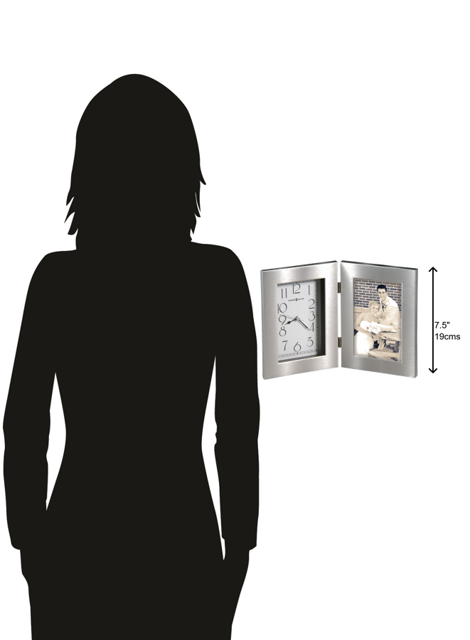 - Multi-Use Metal Table Clock: This metal table clock features a frame with a swirling brushed silver finish. This quality finish surrounds the dial and picture window of this hinged, tabletop clock. The end result is a beautiful and sturdy piece, designed to be placed on any tabletop. Classic Clock Design: The clock portion of this piece features a white dial with black Arabic numerals, black hour and minute hands, silver second hand, and glass crystal. The black and white contrast makes the clock easy to read and simple to pair with any room decor. Picture Frame: More than simply a metal table clock, this unique piece also features a picture frame. It is designed to hold a standard 4-inch by 6-inch photo, allowing you to customize the clock and change out the picture whenever you wish. The entire piece can fold together or apart, fitting to the surrounding space. Quartz Movement: Carefully crafted for dependable use, this metal table clock features quartz, battery-operated movement. The clock requires one AA sized battery. Howard Miller: Founded in 1926 and still family-owned in its third generation, Howard Miller is the world&rsquo