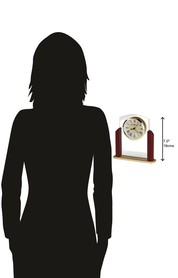 Glass Table Clock: The Winfield is an elegant glass Alarm & Table clock with timeless design features. The gently arched glass table clock features Satin Rosewood Hall finished sides atop a satin gold-tone base. The end result is a piece that not only tells time but also contributes to the style of any room.