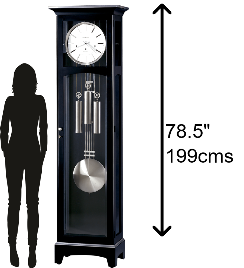 - s collection. Careful Craftsmanship: This black grandfather clock by Howard Miller is finished in Black Satin on select materials, hardwoods, and veneers. This unique piece boasts simple, contemporary elegance. Simple lines best describe the clock&rsquo