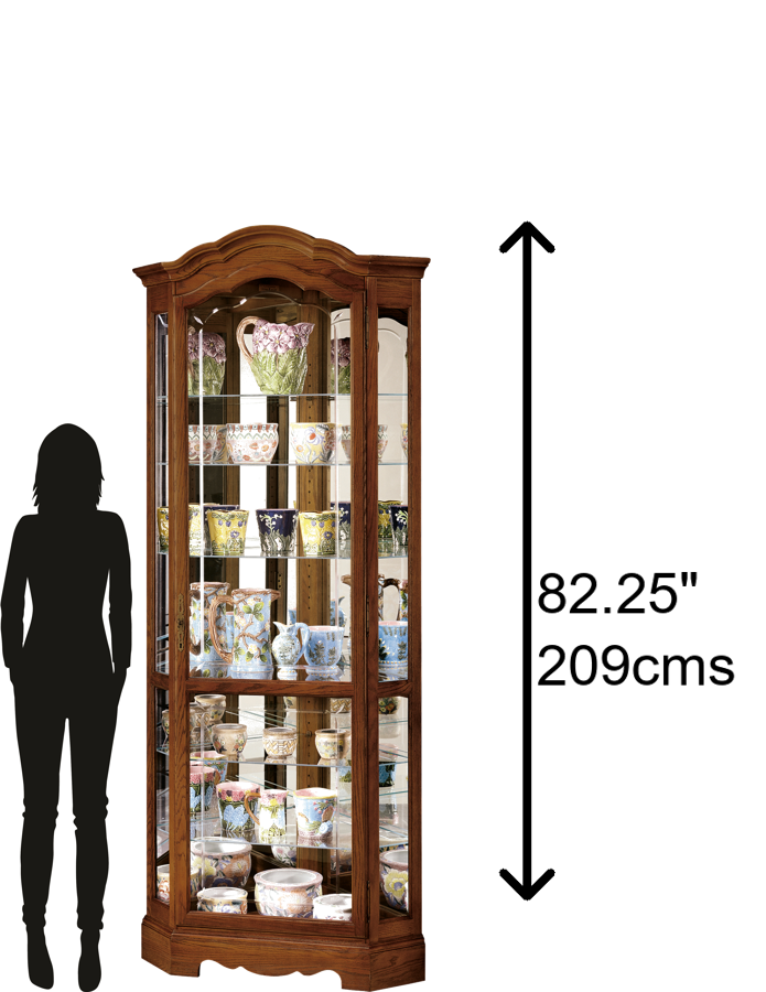 - Enhance your living room with the Jamestown II curio cabinet. It fits into a corner to save valuable floor space and has an Oak Yorkshire finish to complement your furnishings. Durable Construction: Select hardwoods and veneers are used to craft this curio cabinet, which is designed and assembled in the USA. The Oak Yorkshire finish imparts warmth to your space, while the crystal-cut glass front door adds an elegant touch and locks for security. Attention to Detail: The curved pediment of this glass display cabinet has a sophisticated look that goes with most furniture styles. This antique curio cabinet also has a glass mirrored back for a full view of the items inside. Eight Display Levels: The shelves are adjustable to accommodate taller items, and they&rsquo