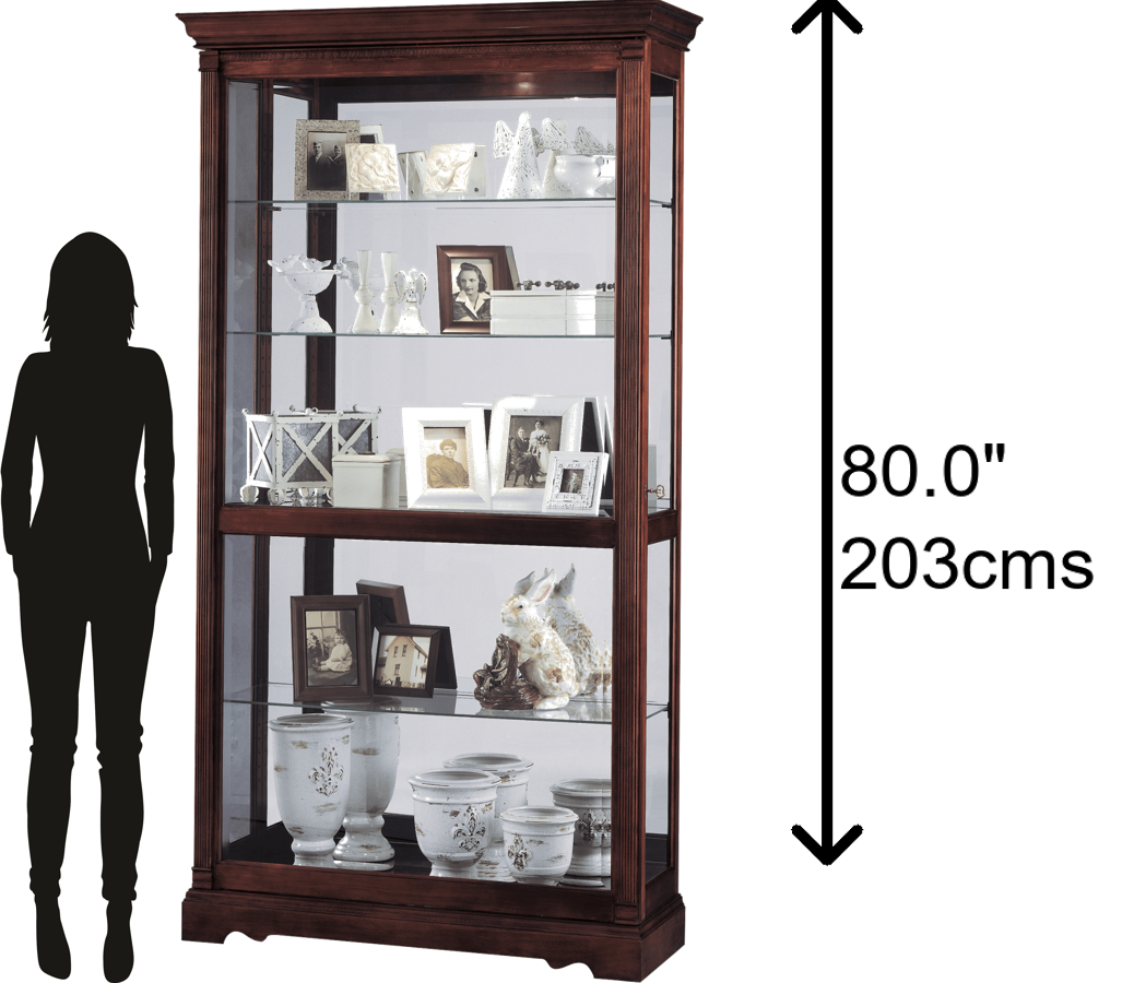 Select Hardwood Construction: This curio cabinet is designed and assembled in the USA. It’s crafted from select hardwoods and veneers, and it has a Windsor Cherry finish for an elegant look. The glass mirrored back accentuates your treasures, while the reeded columns and acanthus leaf molding add sophistication.