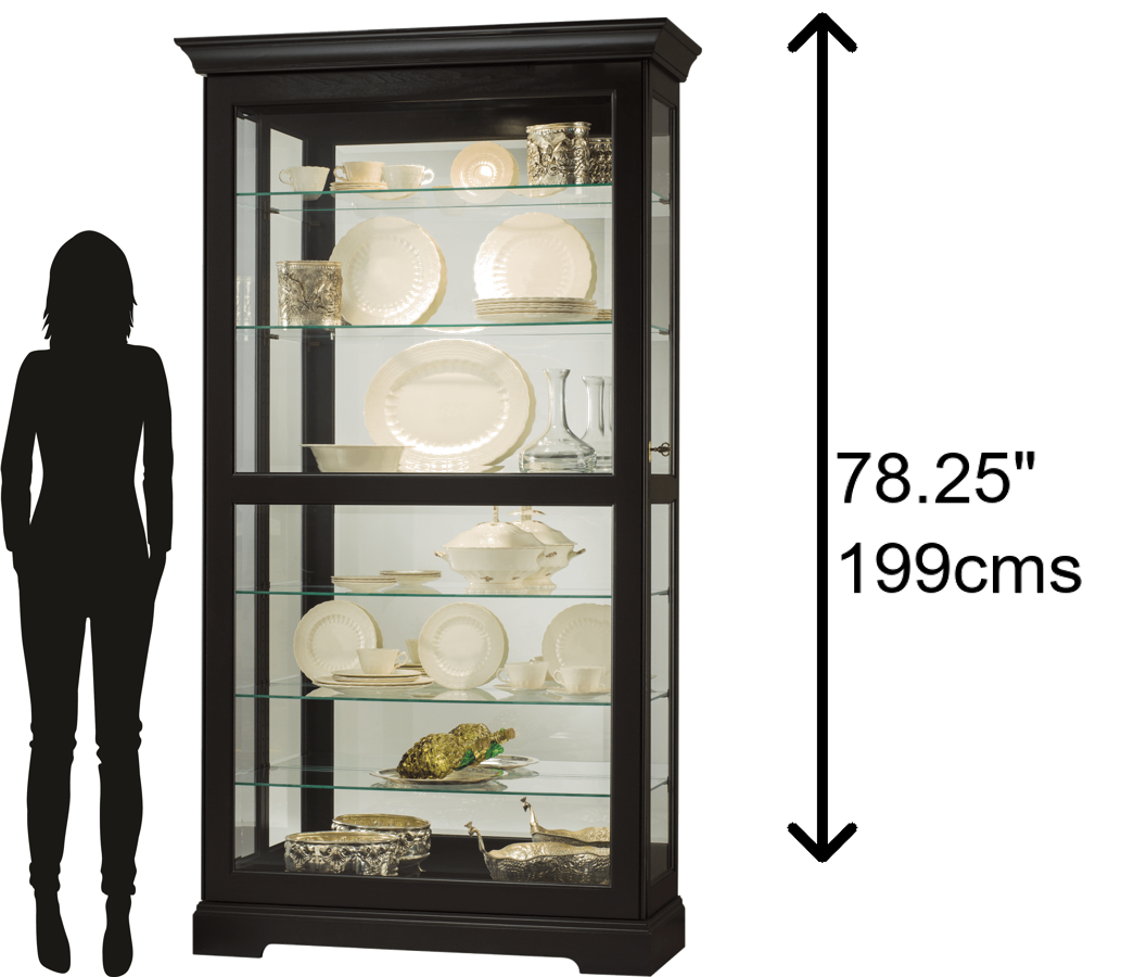 - Beautiful craftsmanship pairs with detailed design in this Howard Miller curio cabinet. Place this glass display cabinet in any room and enjoy showcasing your favorite collectibles in style. Careful Craftsmanship: This stunning glass display cabinet is finished in Black Satin on select hardwoods and veneers, showcasing the elegant craftsmanship of the piece. Detailed Design: No detail was overlooked in the creation of this black curio cabinet. A locking front door with beveled glass slides in both directions for convenient access to shelving. The interior cabinet lighting offers brighter, whiter, longer-lasting light to illuminate your collectibles with a glass mirrored back to enhance the view. Convenient Features: Enjoy the easy-to-use No-Reach&trade