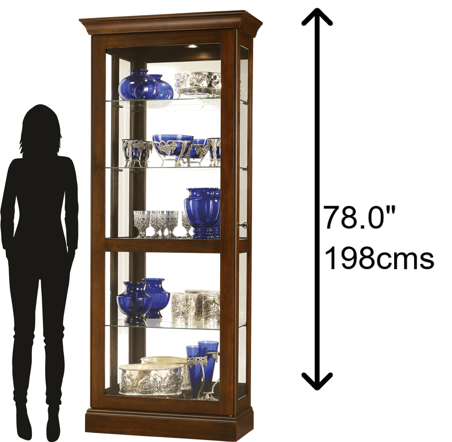 - Featuring a classic design, the Howard Miller Berends IV curio cabinet is the perfect addition to home or office. With a beautiful finish and stunning materials, this glass display cabinet will add notable style to any space. Careful Craftsmanship: Carefully crafted by Howard Miller, this lighted curio cabinet is finished in Cherry Bordeaux on select hardwoods and veneers. Detailed Design: Not a single detail was overlooked in the design of this piece. The front door of the glass display cabinet slides in both directions for easy access to the shelves, while a locking door adds security. The curio cabinet is illuminated by an interior light, and glass mirrored back beautifully showcases your collectibles. Adjustability: Arrange your collectibles exactly as you wish with adjustable shelving. Four glass shelves allow for five levels of display and can be adjusted to any level within your cabinet. The Pad-Lock&trade