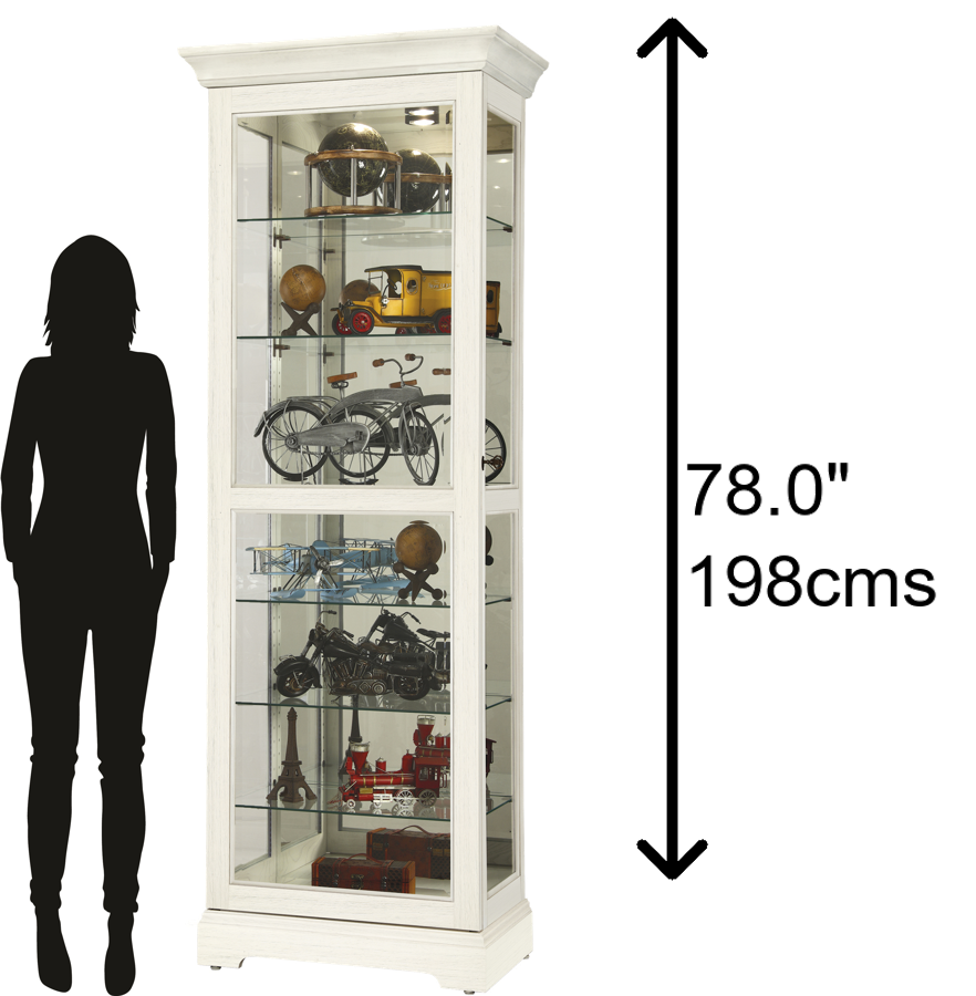 - More than just a glass display cabinet, the Howard Miller Martindale V curio cabinet will add elegance to any space. Display your favorite collectibles on its adjustable shelving. Careful Craftsmanship: Aged linen finish on select hardwoods and veneers is wire brushed for a natural, reclaimed wood appearance. Detailed Design: A stunningly detailed design sets this white curio cabinet apart. Beautiful beveled glass enhances the front door, and cabinet lighting offers brighter, whiter, longer-lasting light to illuminate your collectibles. Finally, a glass mirrored back beautifully showcases your collectibles. Convenient Features: Enjoy the easy-to-use No-Reach&trade