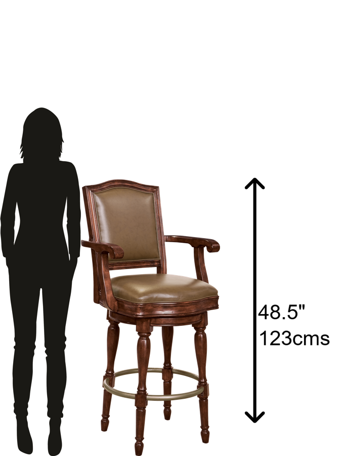 - This swivel barstool features a brown faux leather seat cushion and backrest and an antique brass-tone footrest.