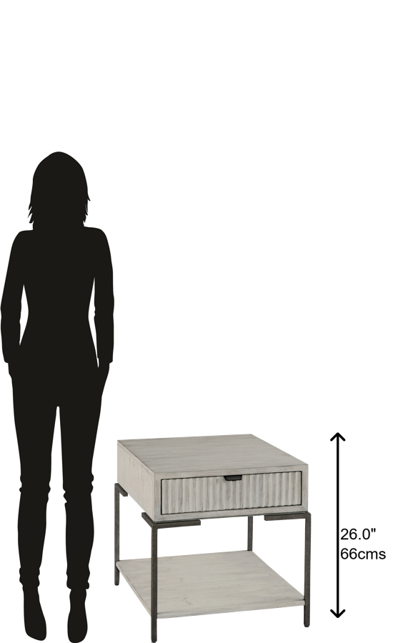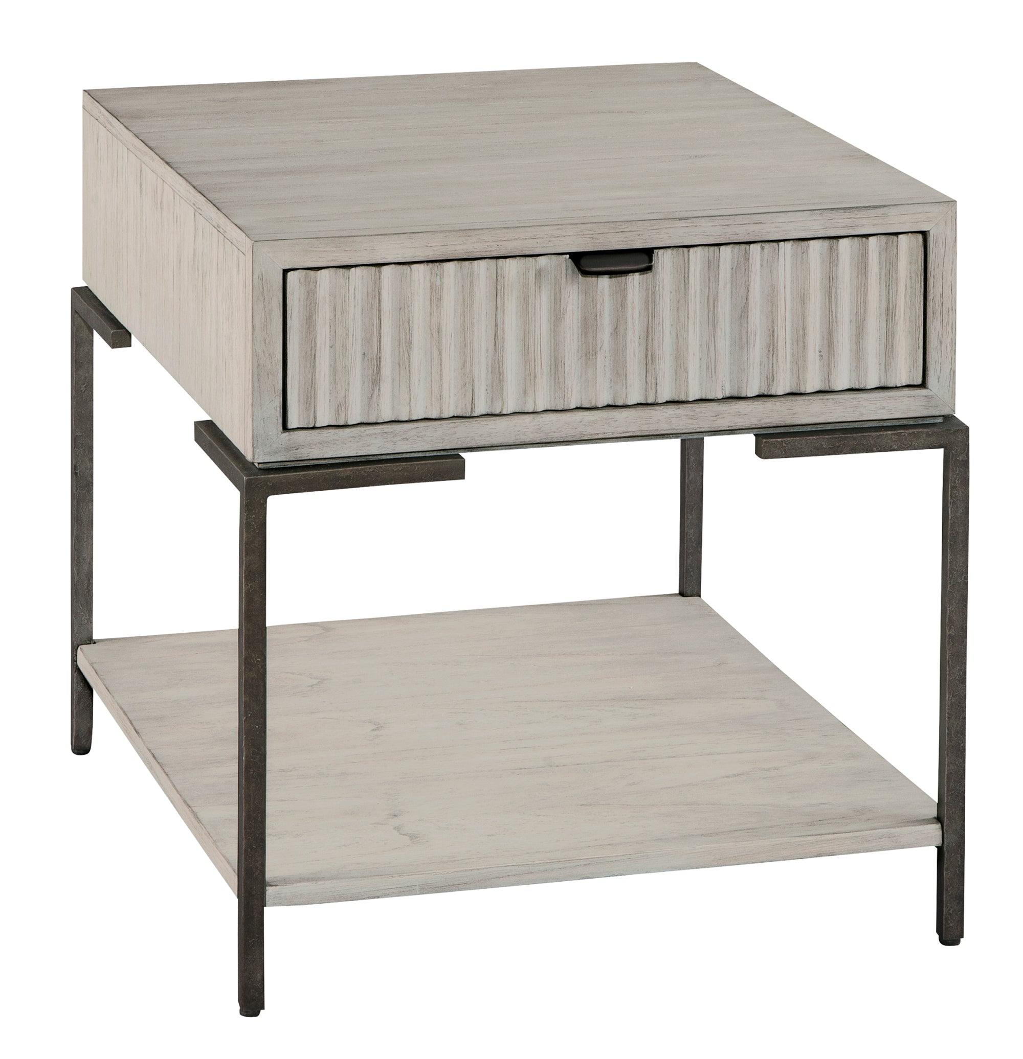 - Single drawer with serrated front and tab pull in iron blac finish.