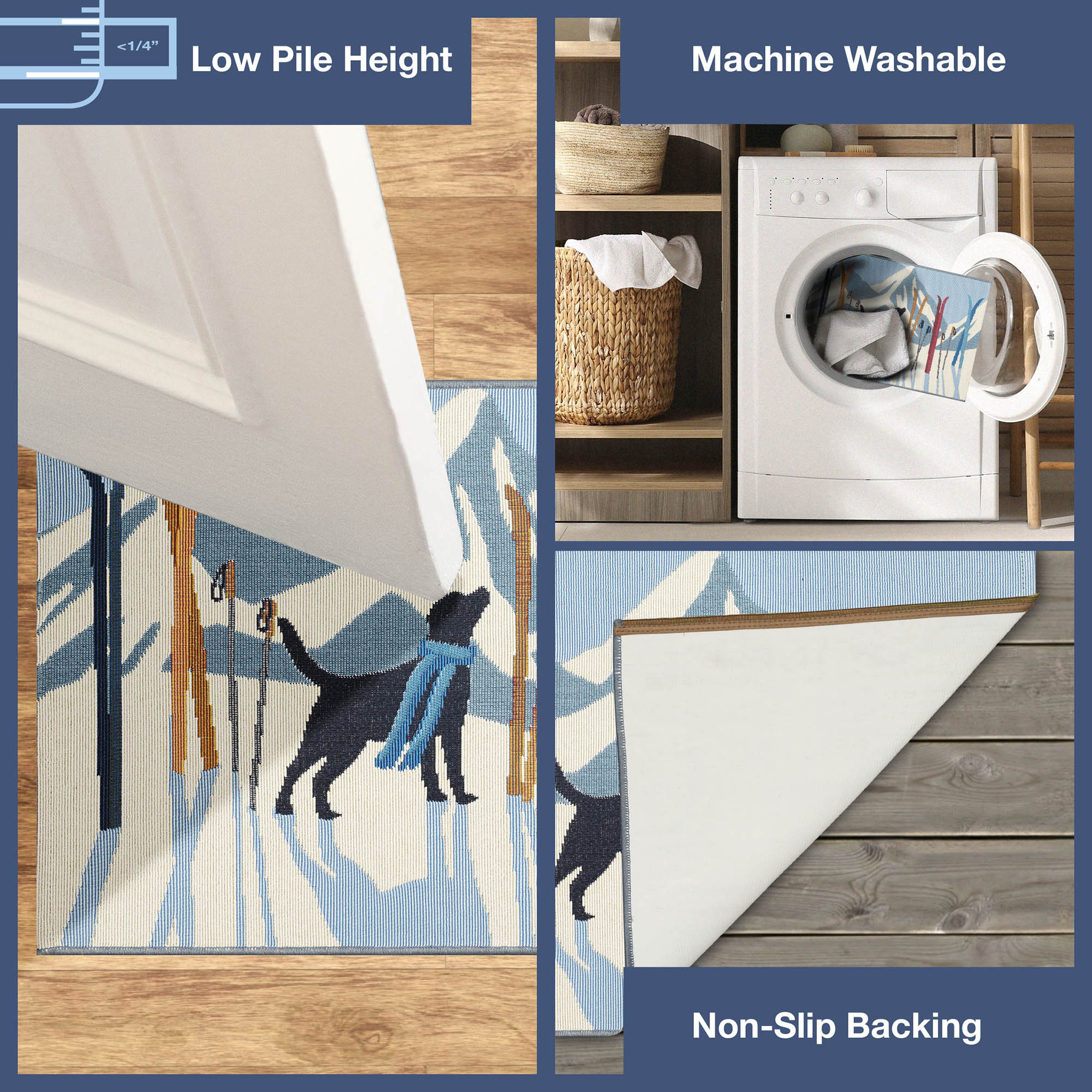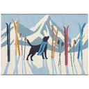 - Features a Contemporary, Winter, Novelty, Festive, Whimsical, Colorful, Decorative, Holiday, Sports Accent mat with a black lab on a snow covered mountain surrounded by skis.
