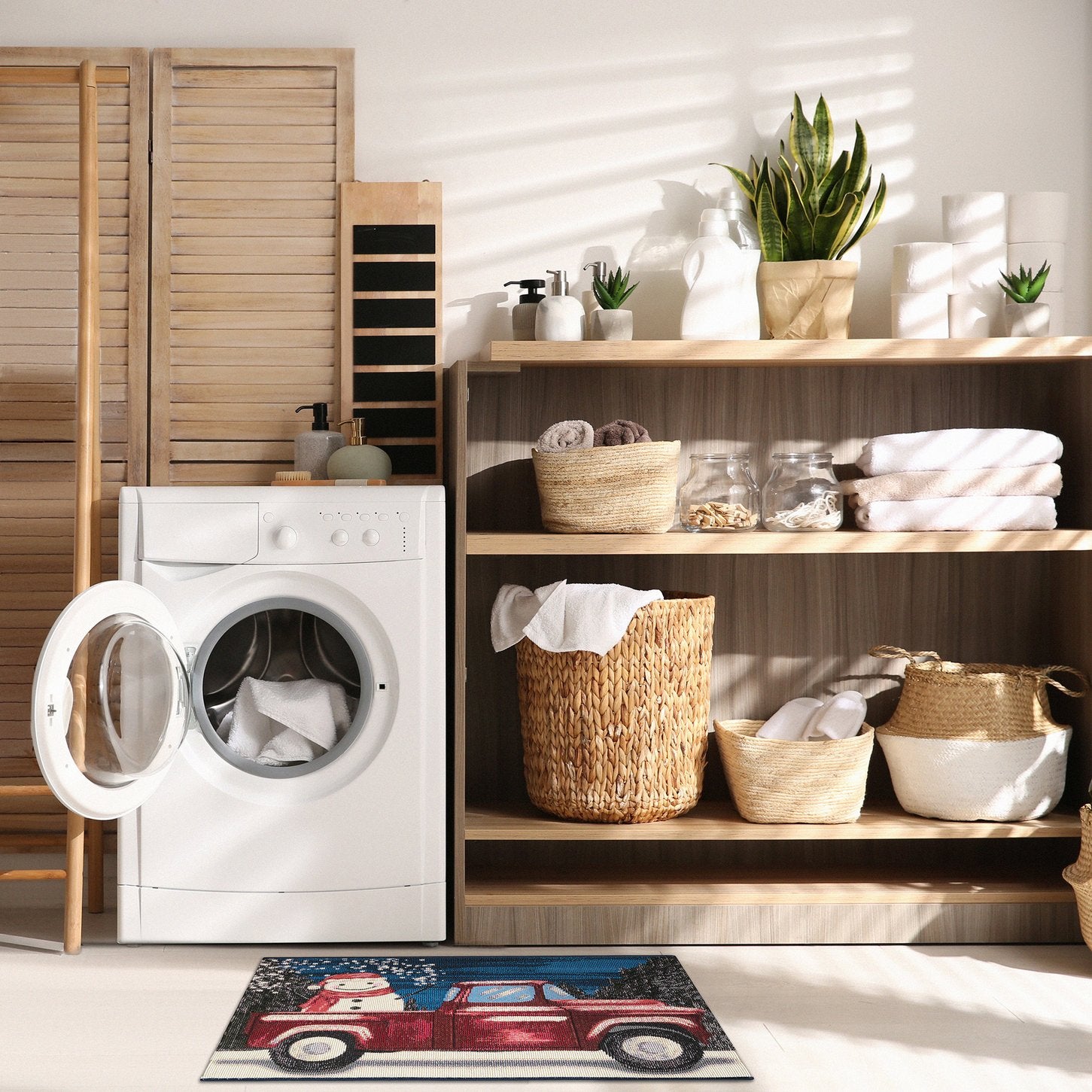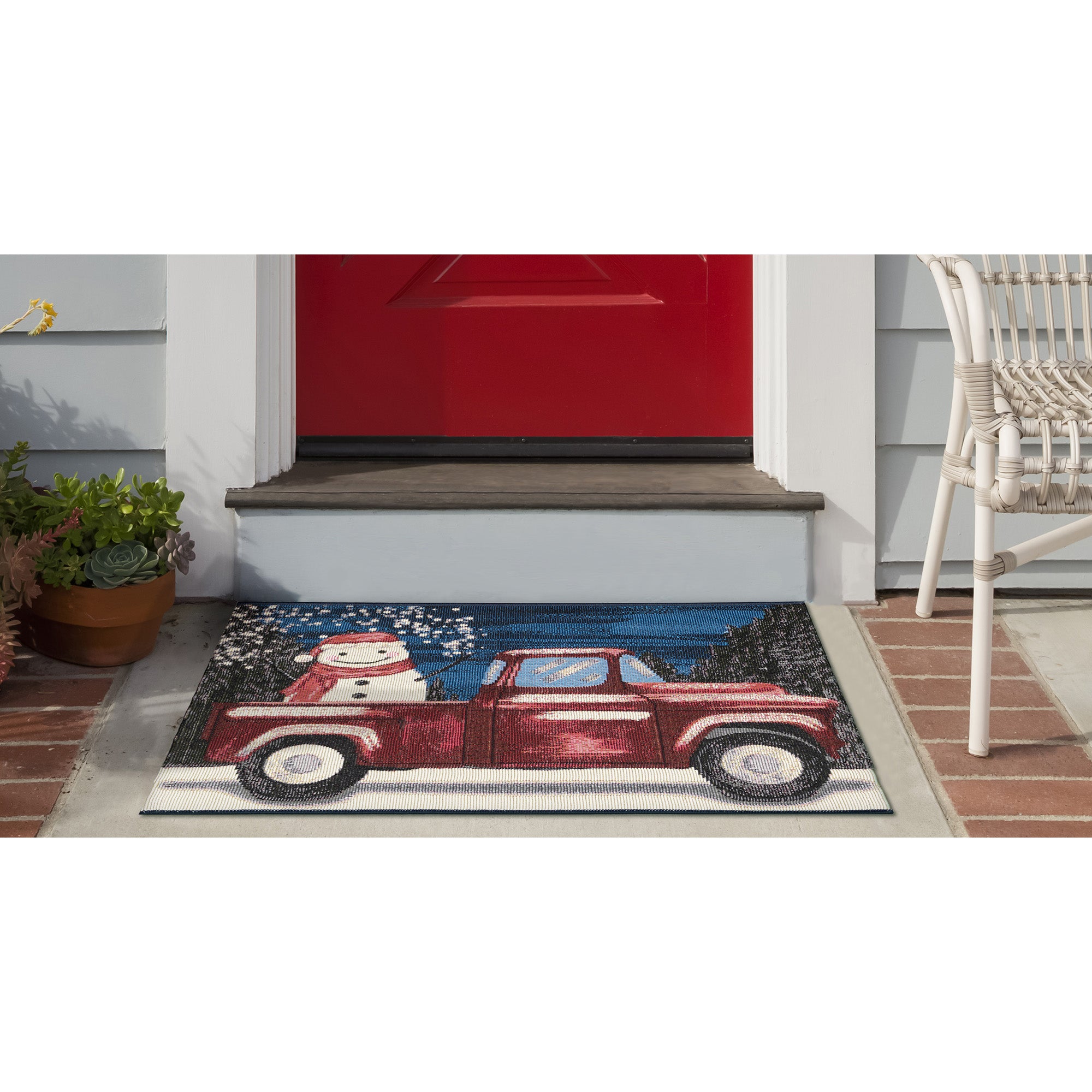 - Features a Holiday Winter All-Purpose Casual Home Festive Decorative Multicolor mat with a vintage red pickup loaded with a smiling snowman decorated with a scarf and Santa hat
