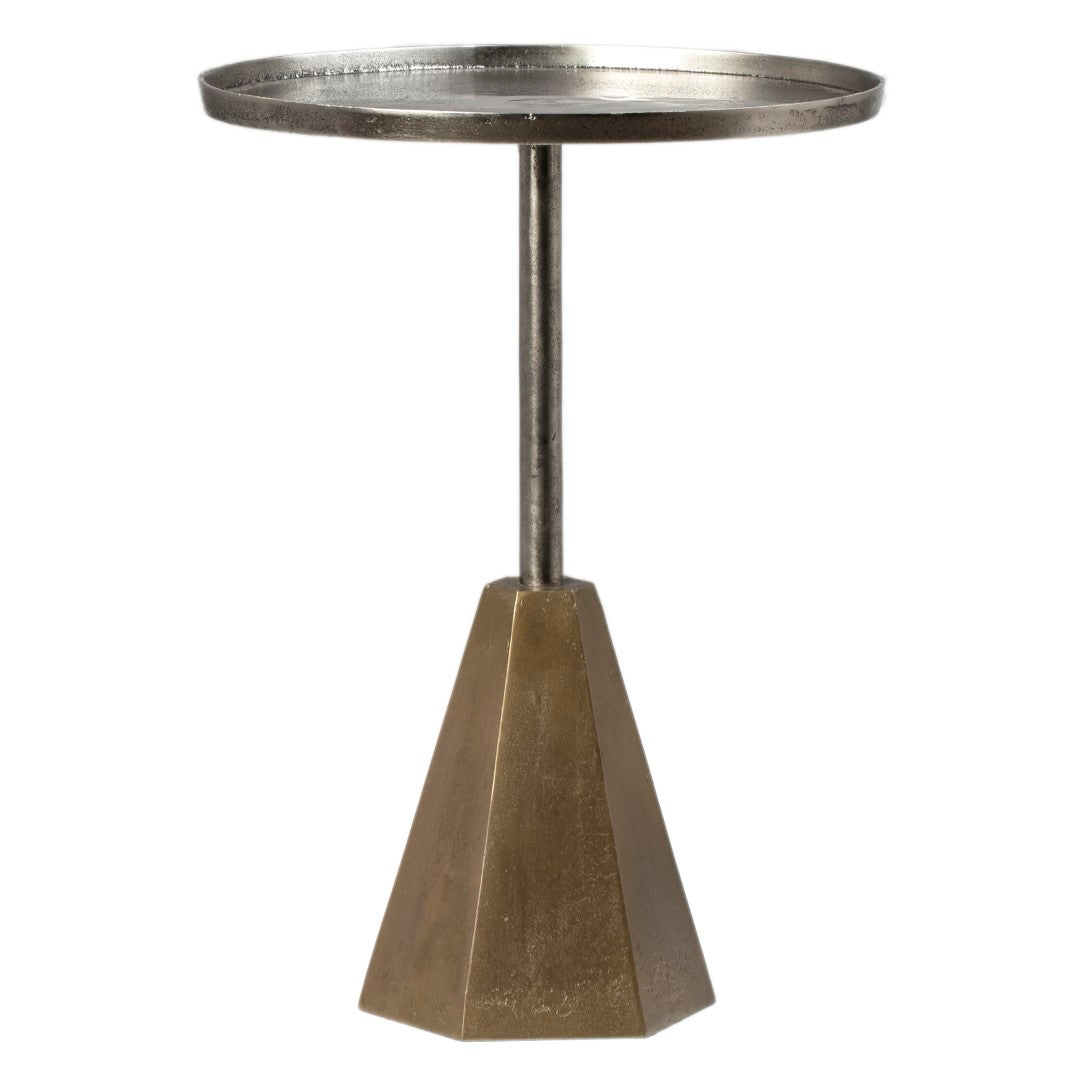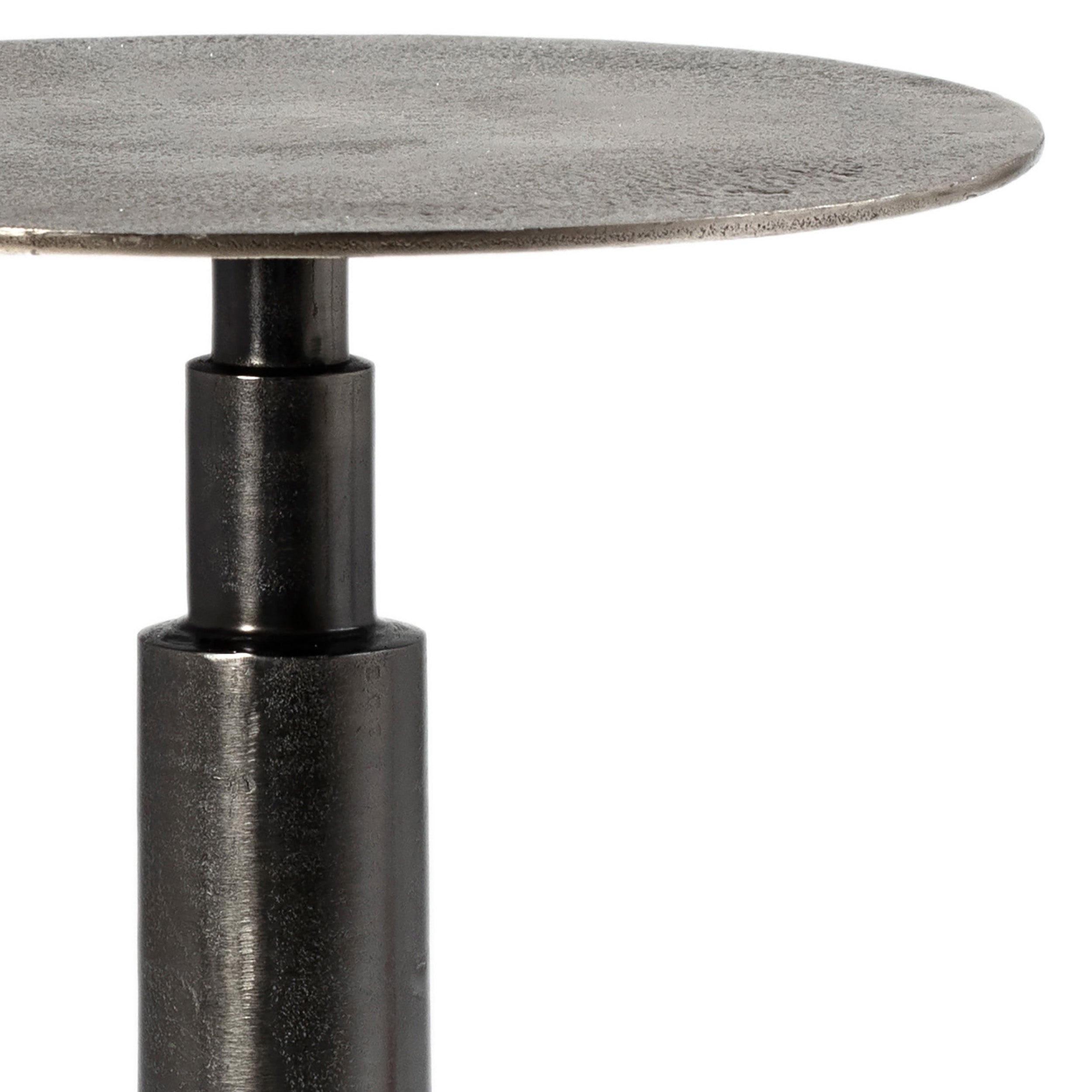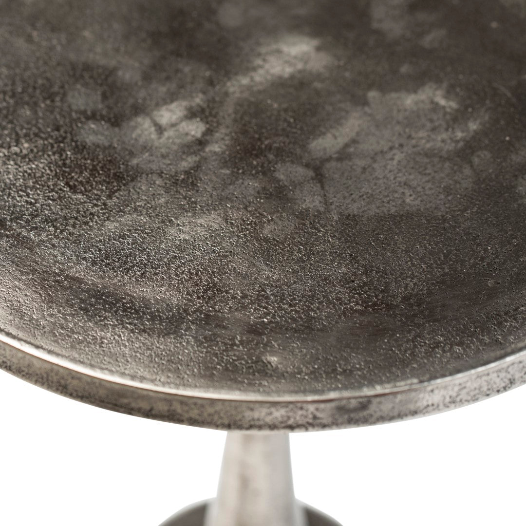 - Short Description: Industrial Styled 18" Round Cast Aluminum Side Table with a Double Tapered Pedestal Base Finished in Antique Brass
