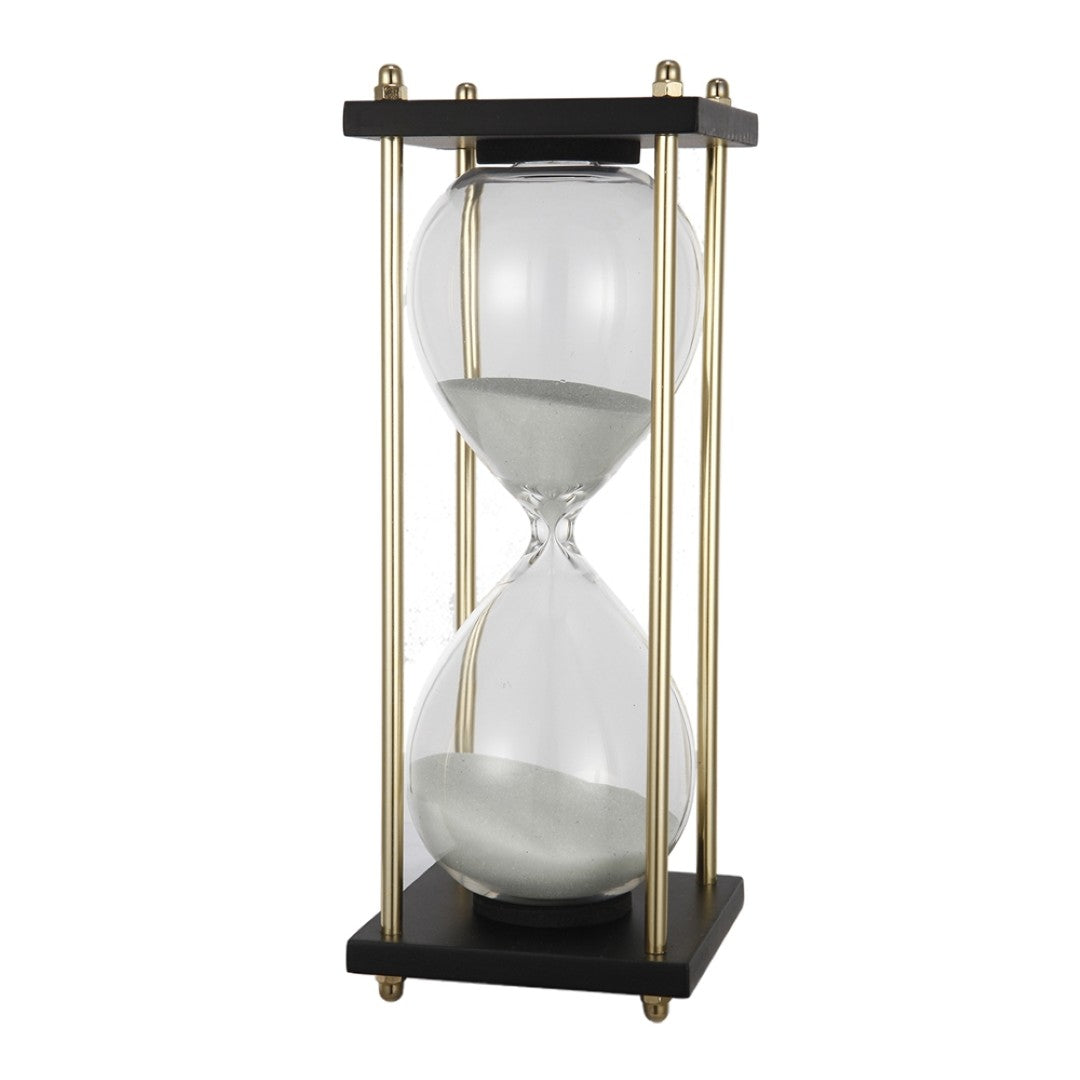 A striking blend of form and function, this elegant hourglass pair provides a visual reminder of time while bringing refined style to desks, shelves, or mantel displays. Filled with clean white sand and set in a black-and-brass stand, the duo complements modern and transitional interiors and serves as both a decorative accent and a conversation piece. Each hourglass times approximately 30 minutes, making them useful for focused work sessions, meditation, or simply marking the passage of time.