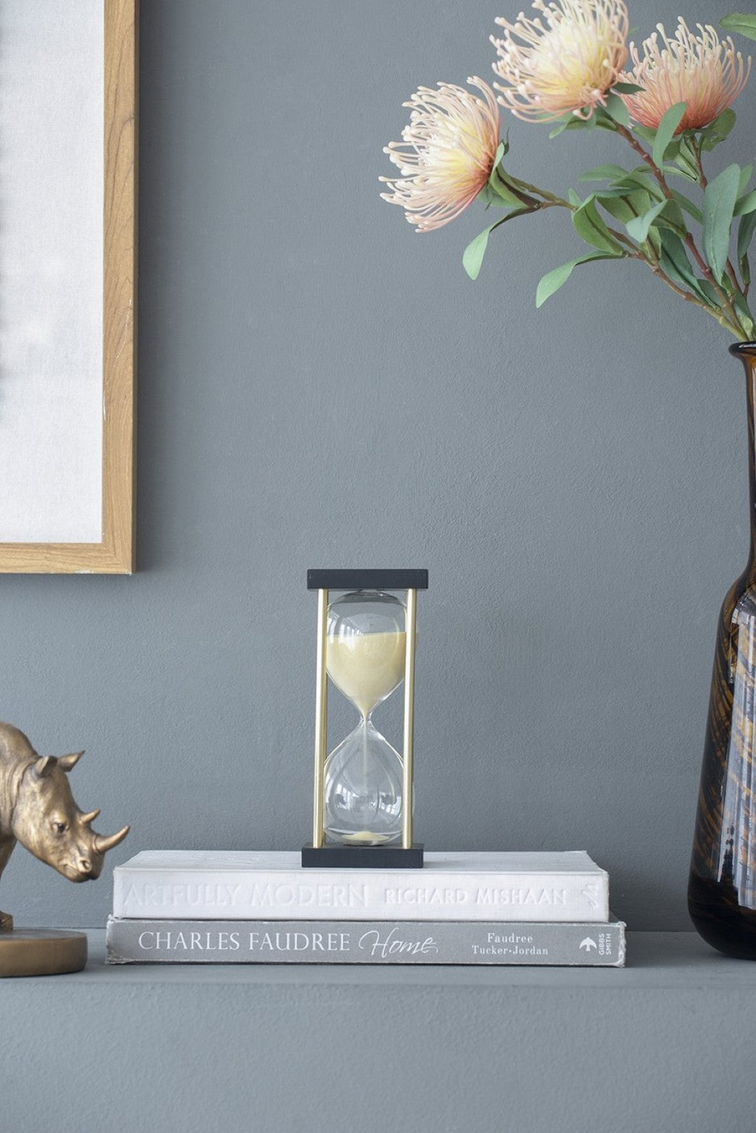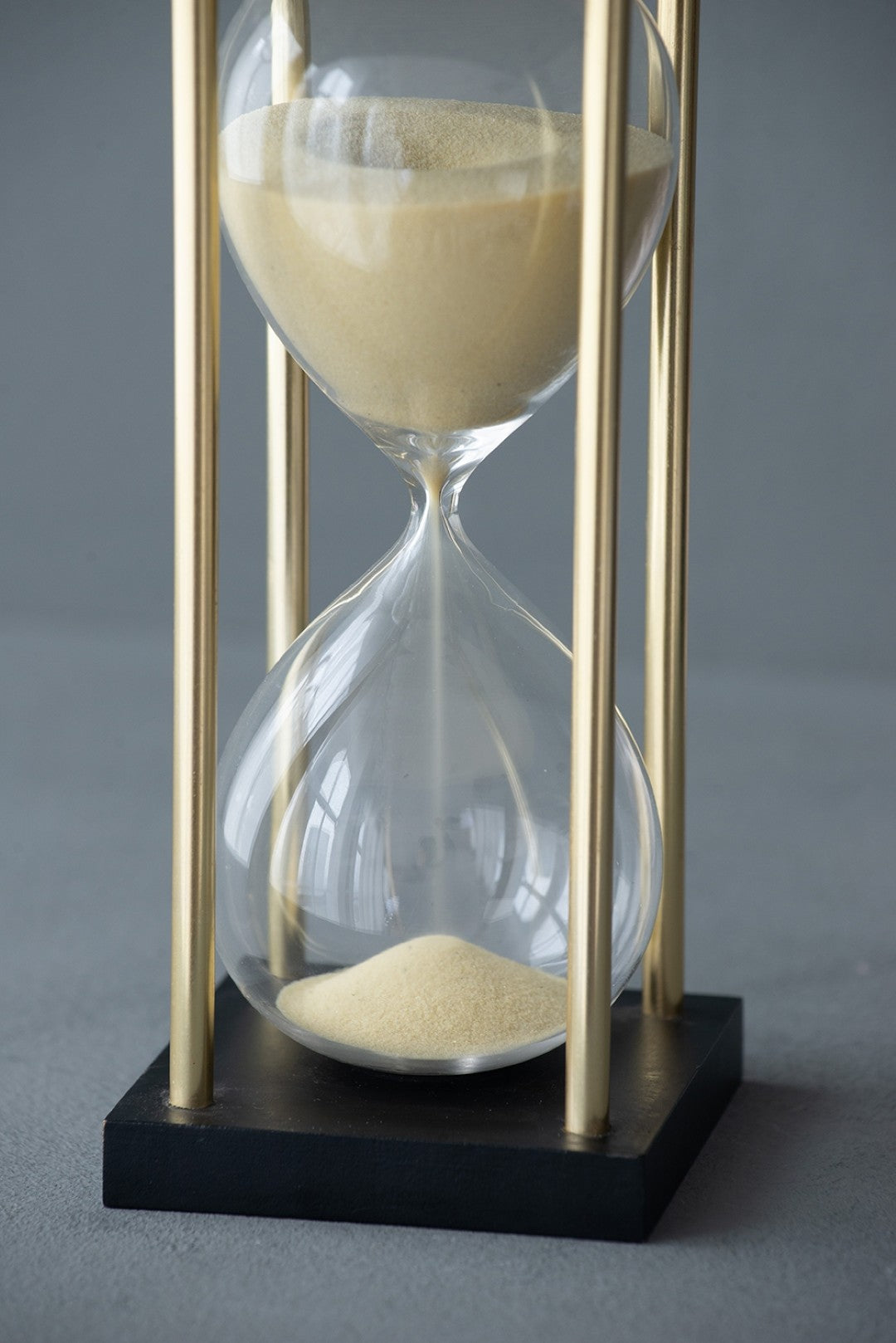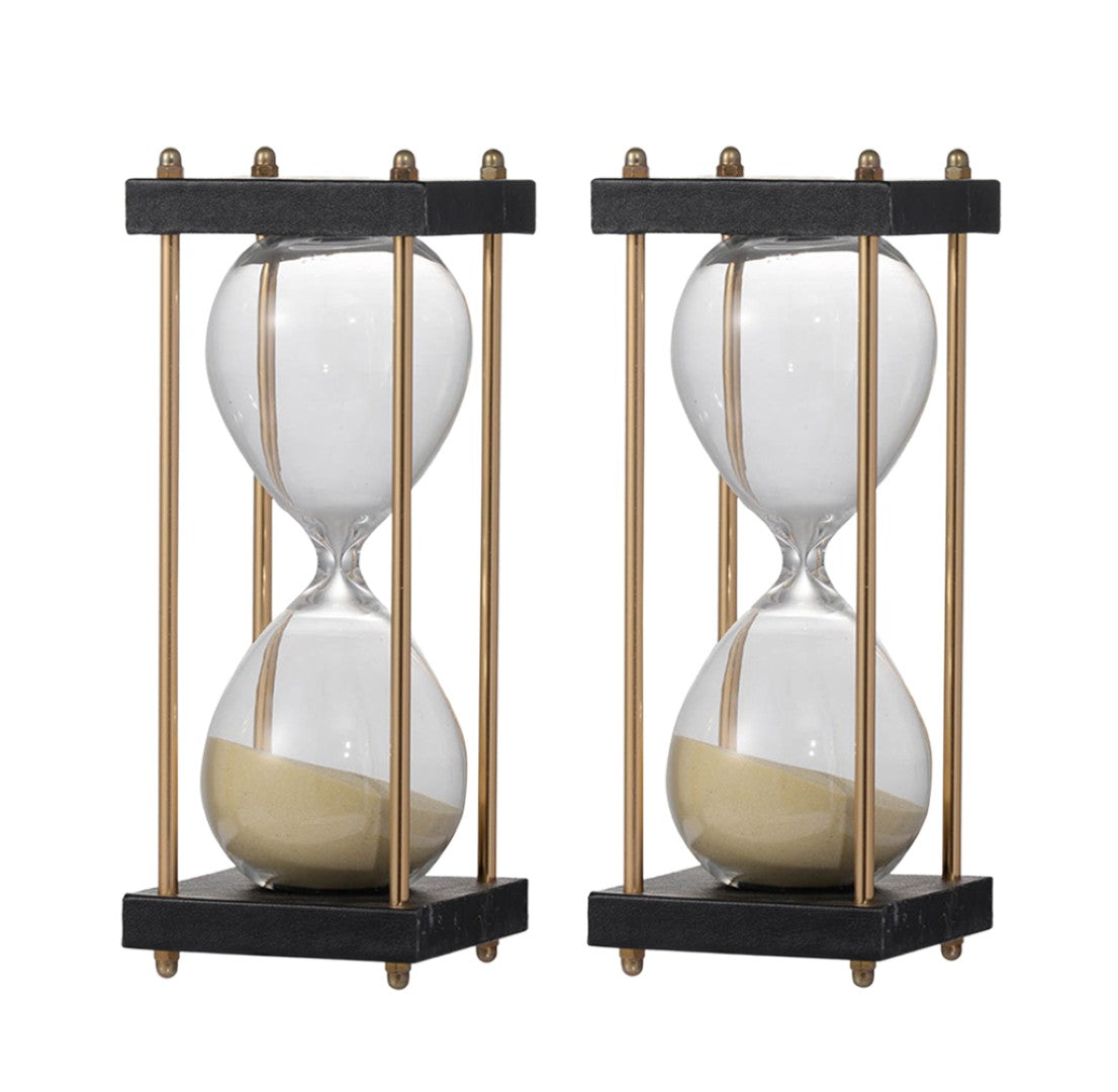 - Durable glass hourglass secured in an aluminum/metal frame finished in a distinctive black-and-gold combination for visual contrast