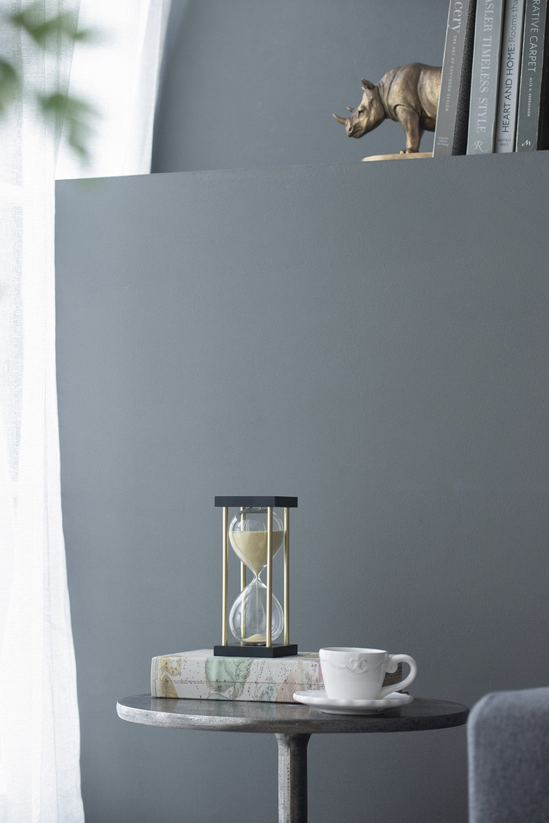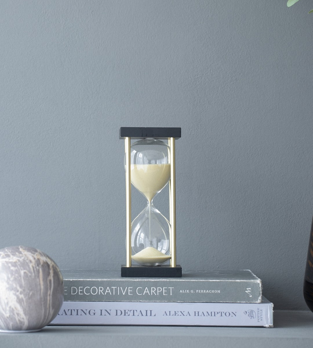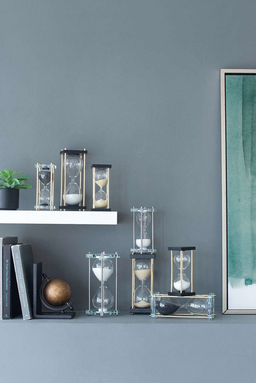 - Durable glass hourglass secured in an aluminum/metal frame finished in a distinctive black-and-gold combination for visual contrast