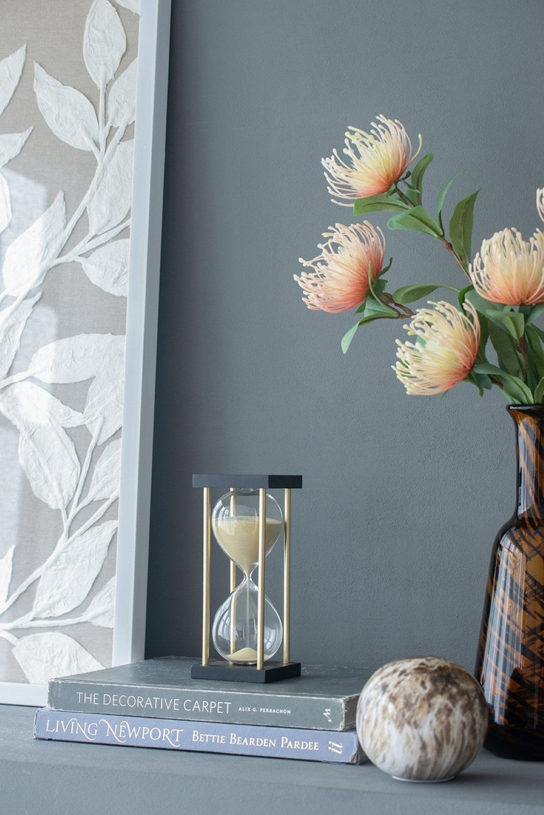 Add a touch of timeless elegance to any room with this framed 15-minute hourglass. Neutral tan sand flows smoothly between glass bulbs, providing a visually calming way to mark short intervals while the metal stand offers sturdy support and a refined, mixed-metal finish that complements a variety of decor styles.