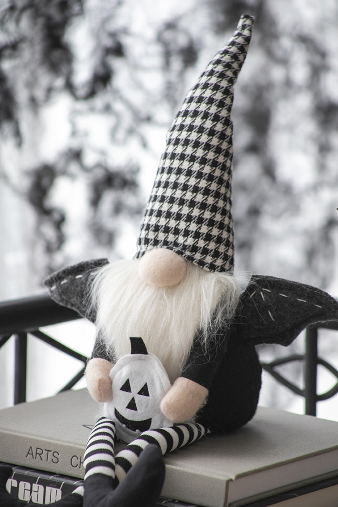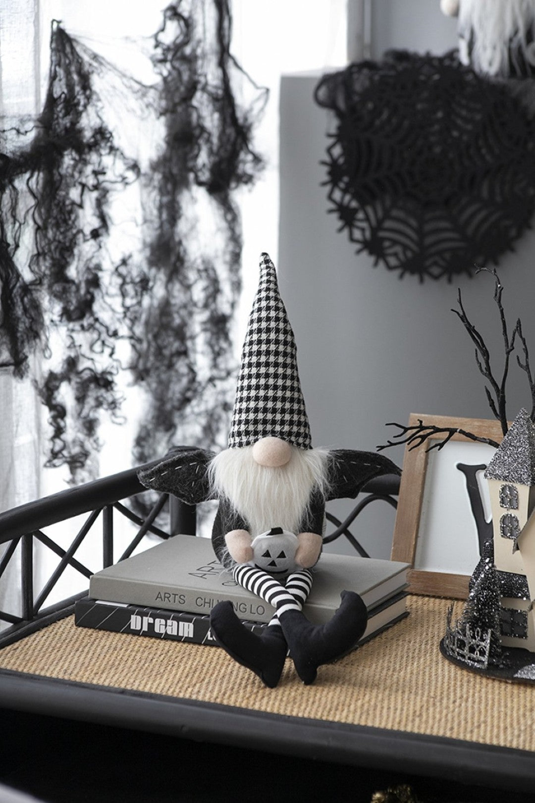 Bring whimsical Halloween charm to your home with this handcrafted duo of sitting black gnomes. Each gnome features delicate wings and a stylish black-and-white plaid hat, crafted with careful attention to detail for a playful yet polished seasonal accent. Perfect for mantels, entryways, or tabletop displays, these lightweight figures add personality without overwhelming your space.