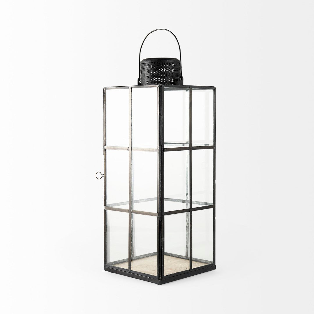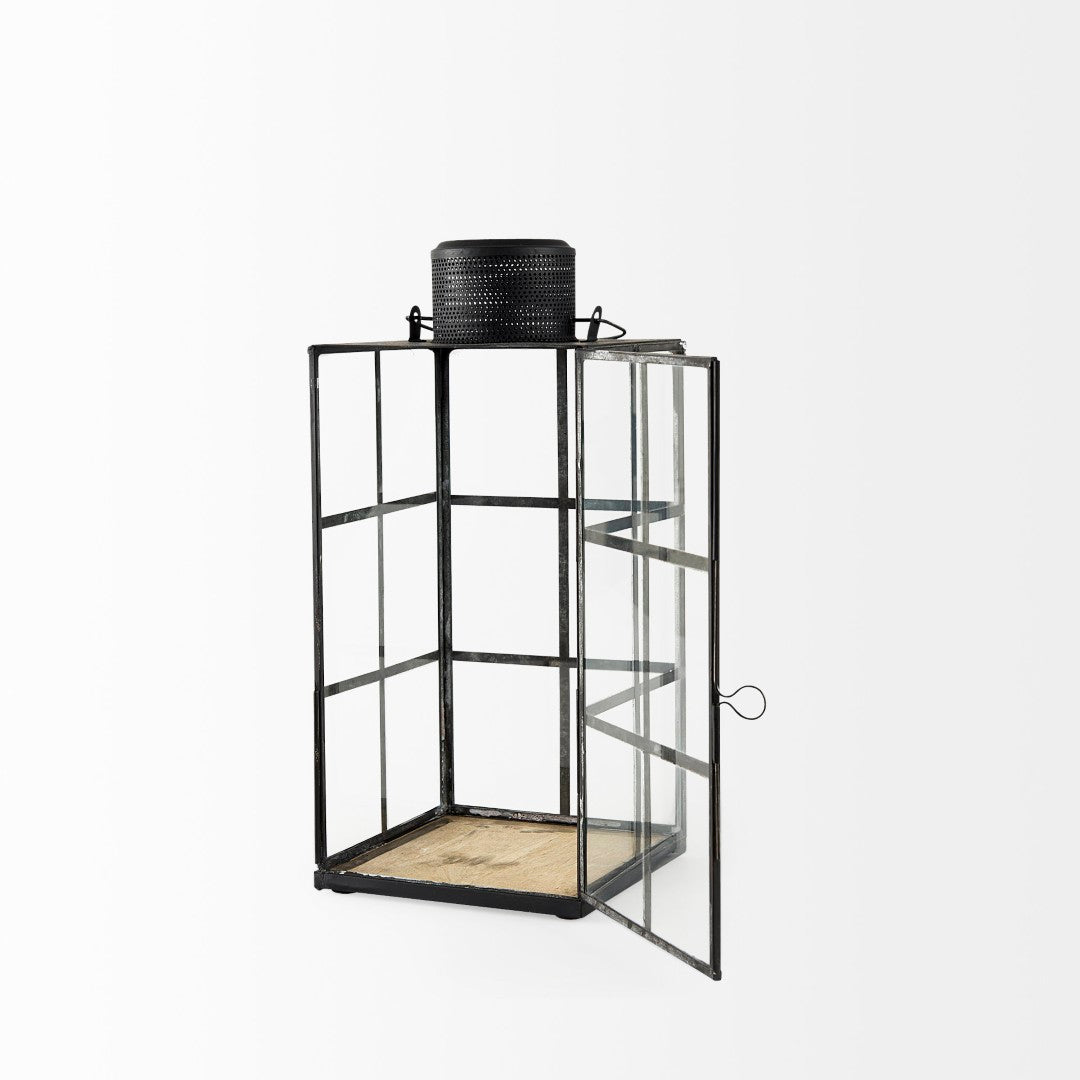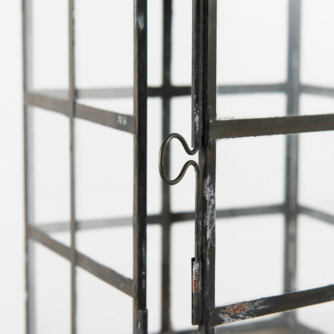 Bring industrial charm to any room with the Gamfield small lantern. Its clear glass panels set within a distressed black metal grid evoke factory-style windows, creating a striking focal point whether used solo or grouped. The hinged front door and rugged patina make it both practical and decorative—ideal for soft interior ambiance, seasonal displays, or accent lighting in loft, farmhouse, or modern-industrial settings.