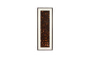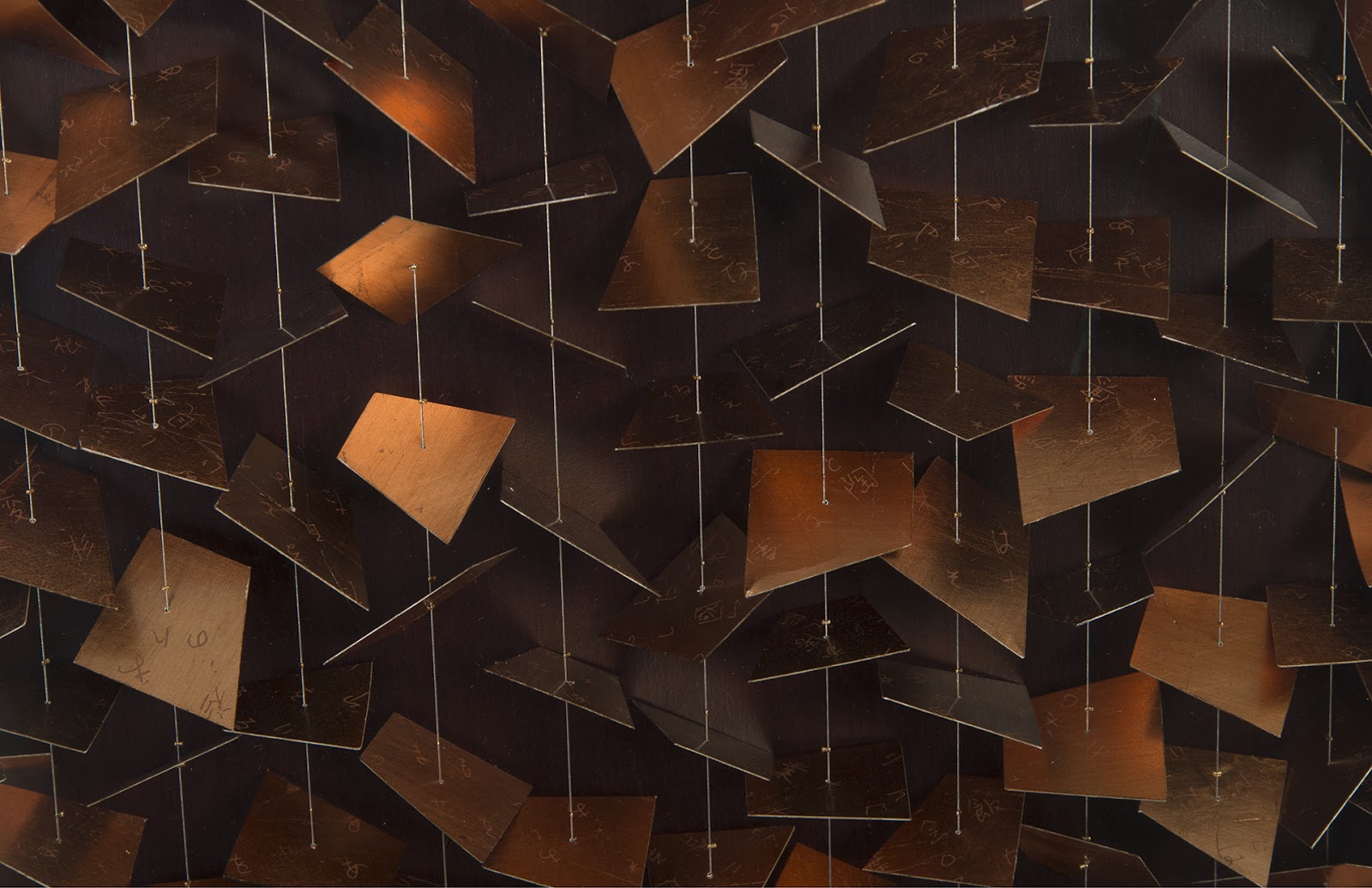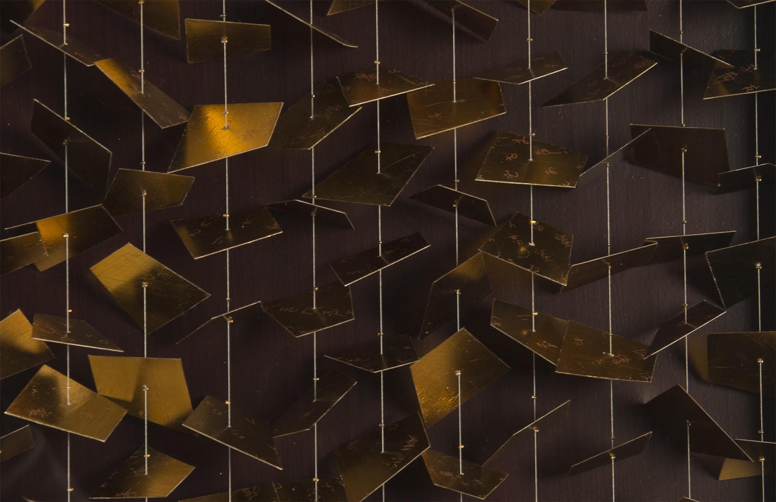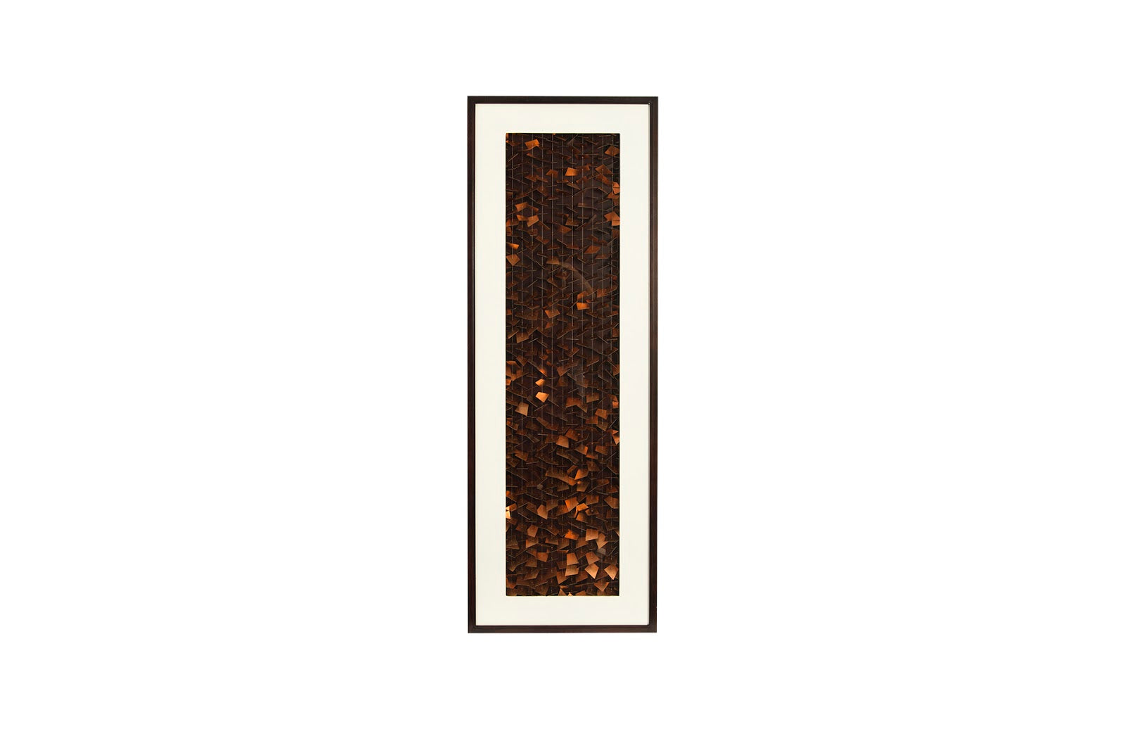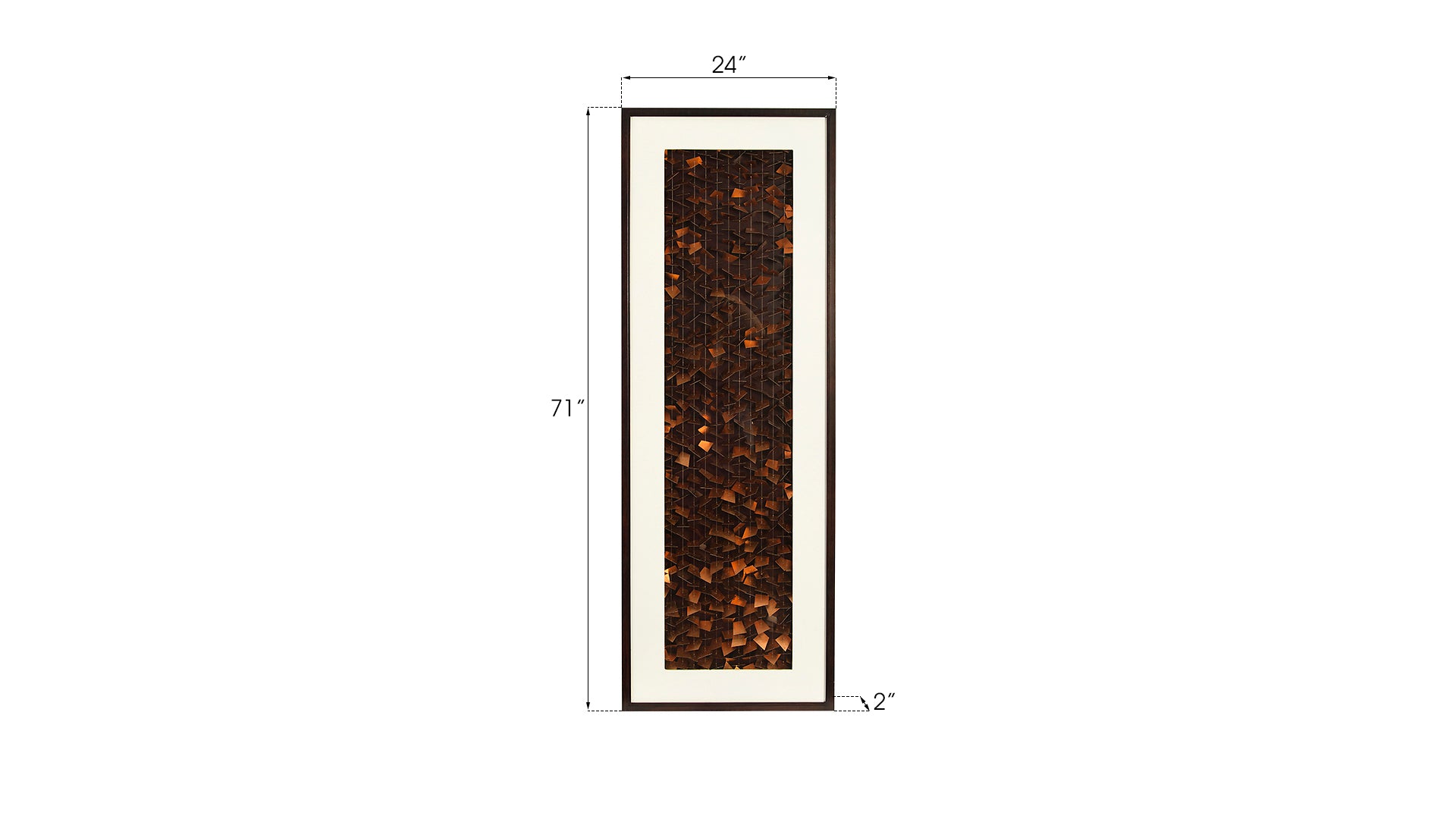Small squares of metal are delicately strung inside a frame to create a golden glisten. This stunning piece will run the show in any space.