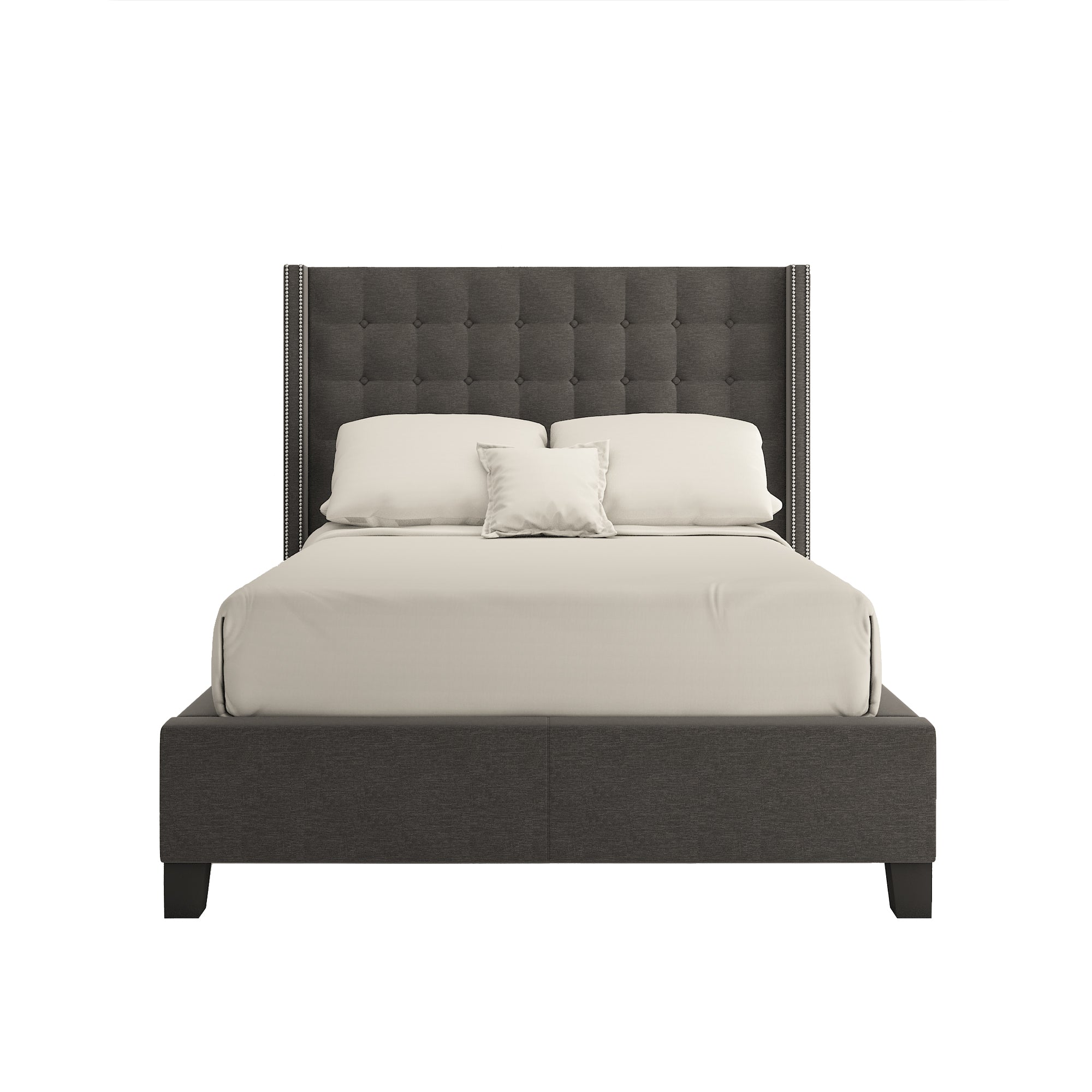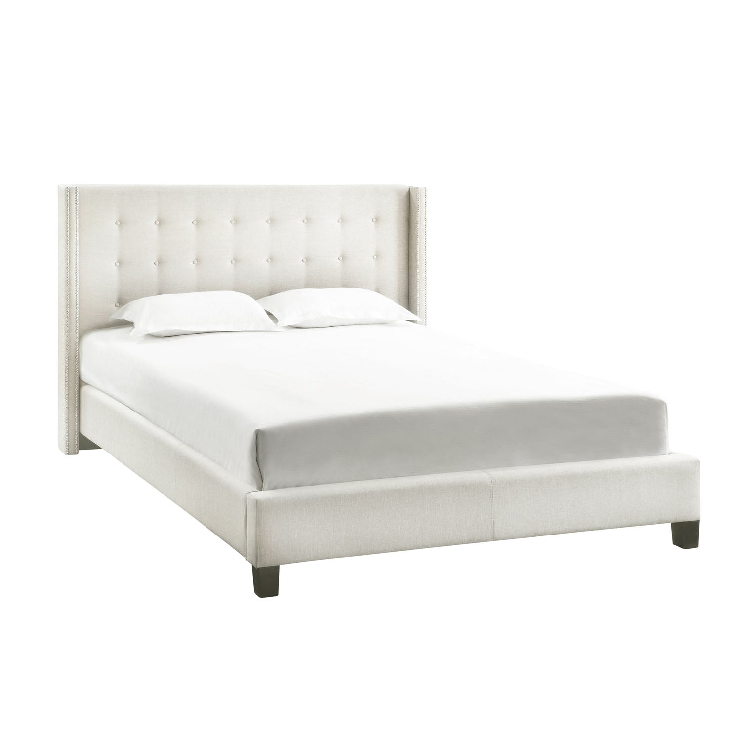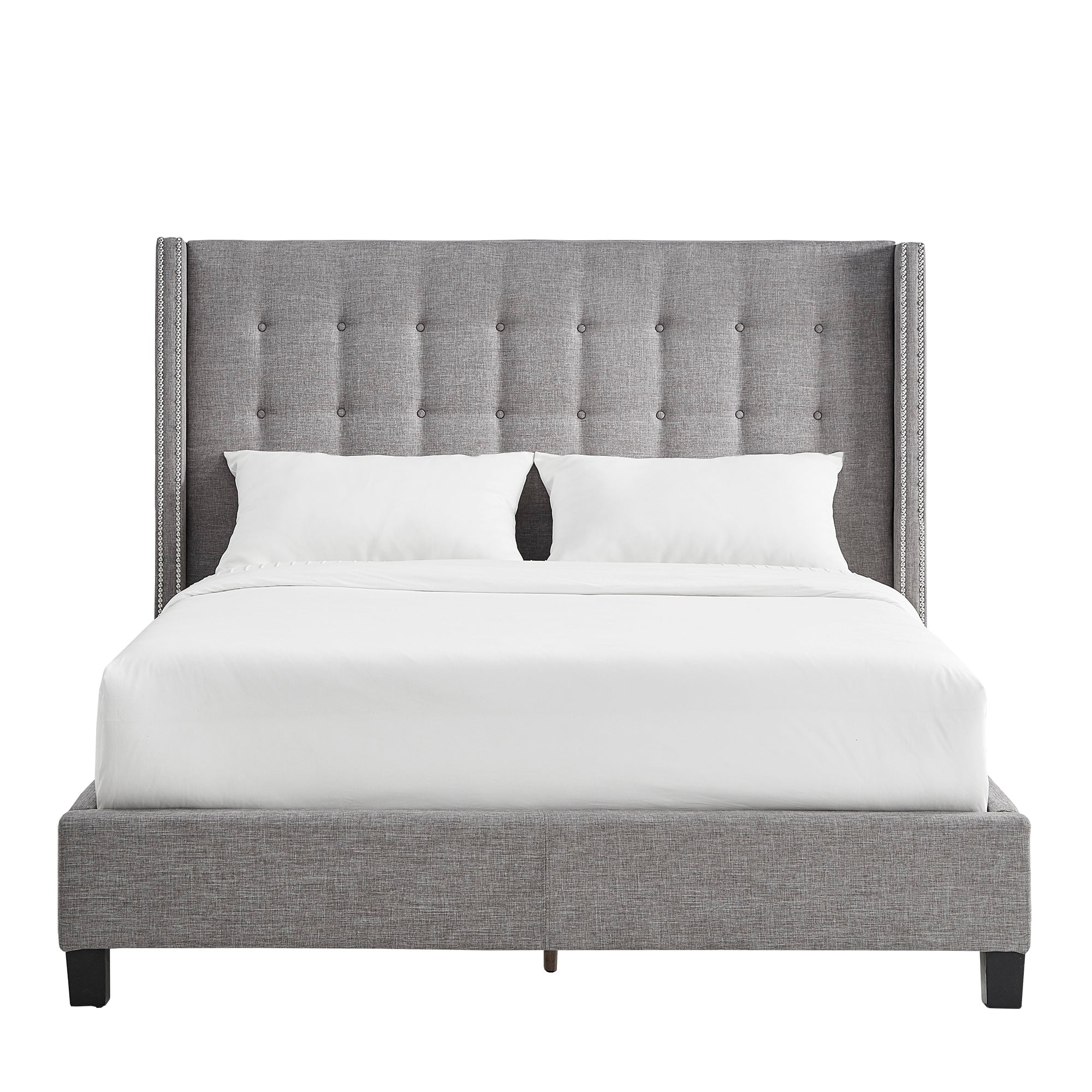 - Features wingback style headboard with nailhead trim and button tufting