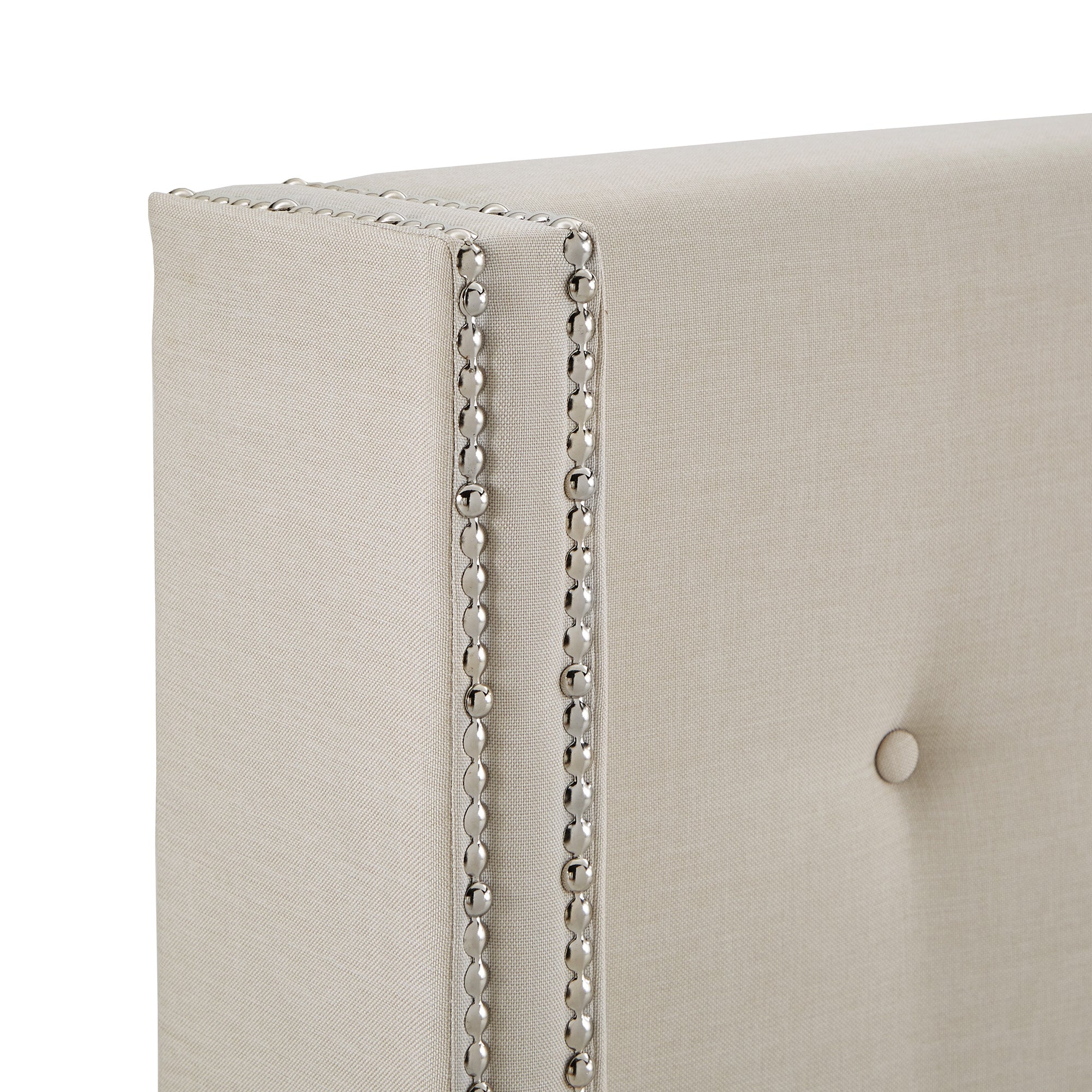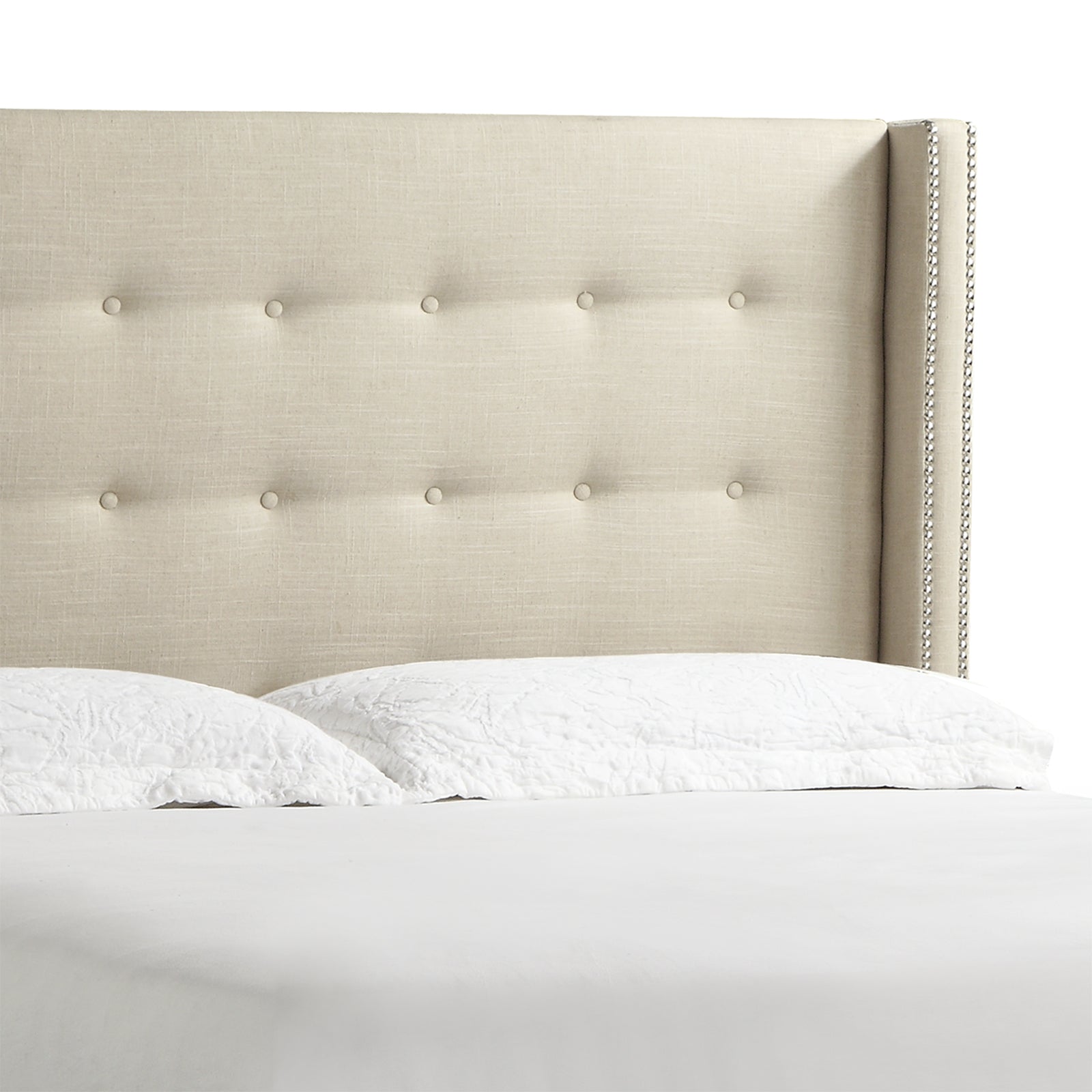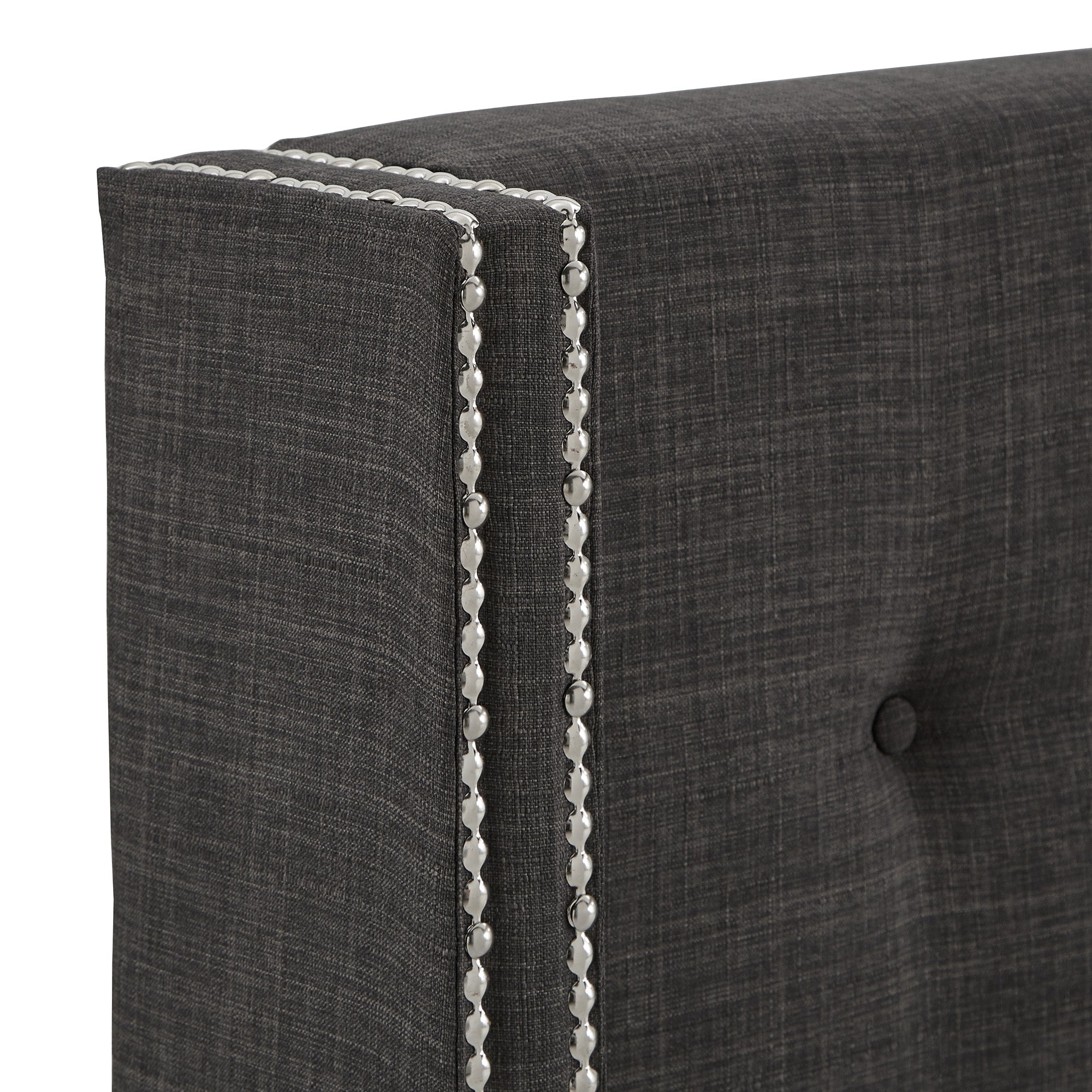 - Features wingback style headboard with nailhead trim and button tufting