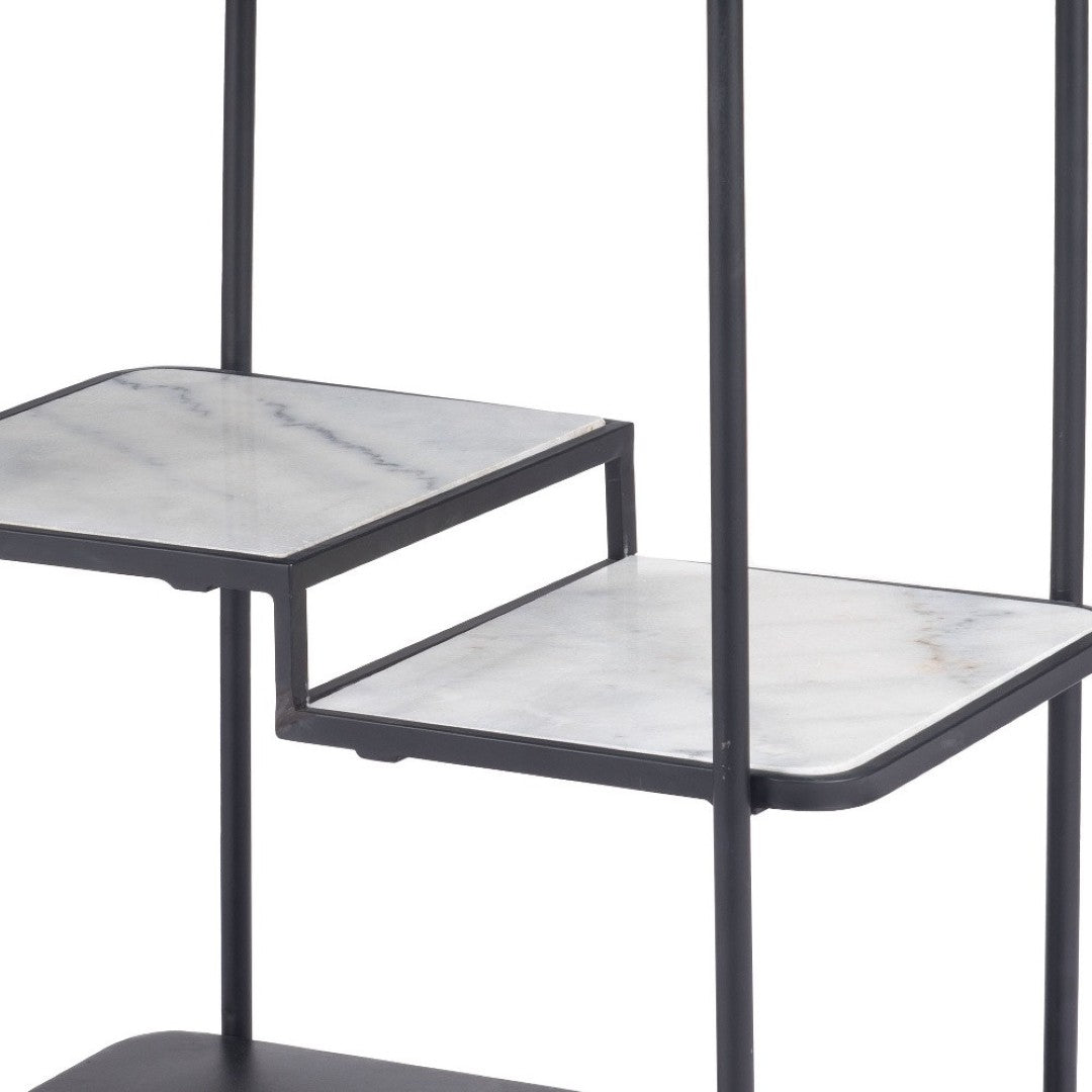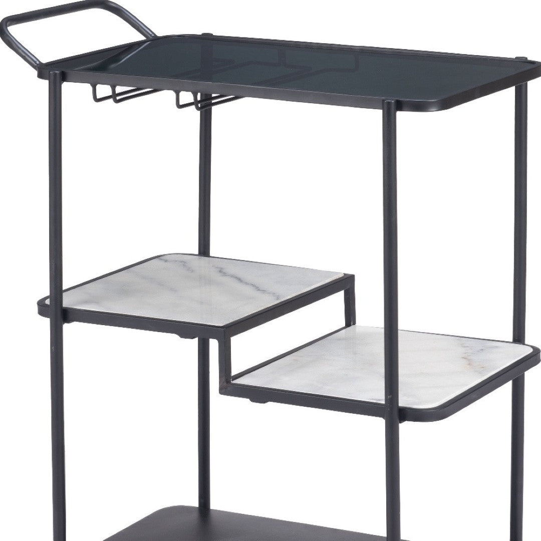 - Features a black tinted tempered glass top, genuine white marble middle shelves, and a sturdy steel bottom shelf.