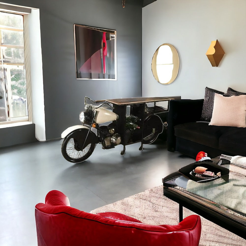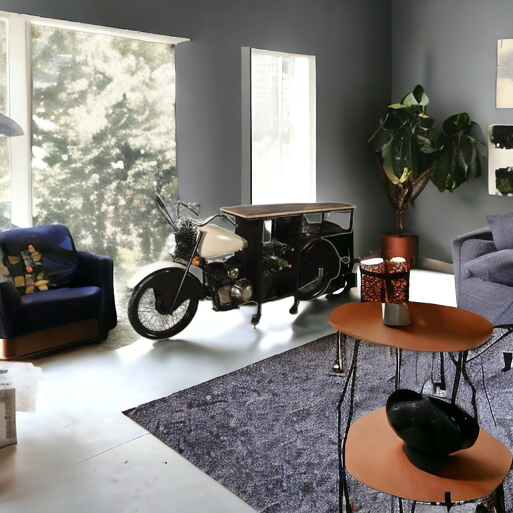 - Industrial-style bar cart with a novelty motorcycle metal frame. Reclaimed and rustic by design for an authentic look.