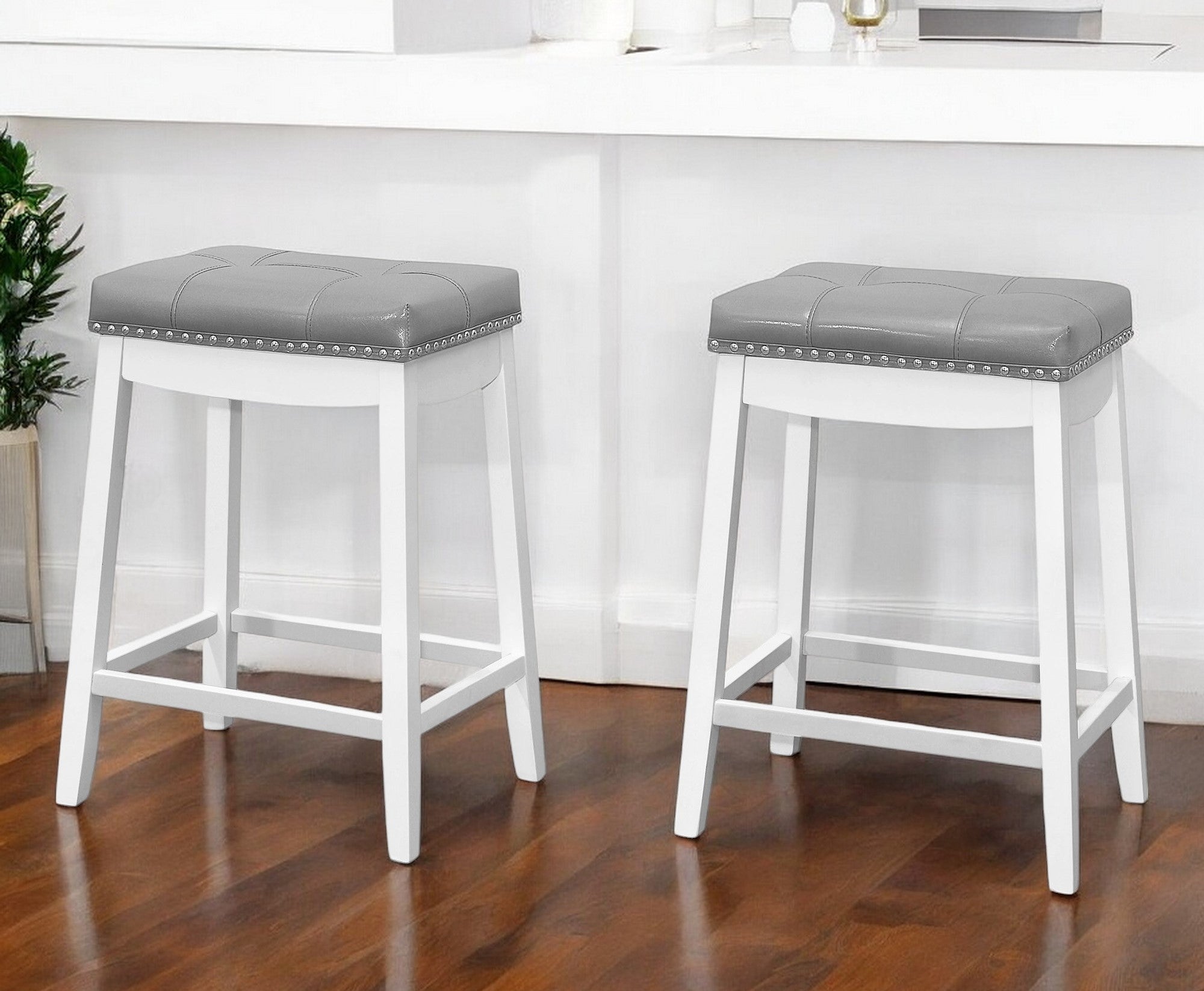 - Seats are padded for comfort and upholstered in a grey leather-look fabric with biscuit tufting and trimmed with silver nailheads for a decorative look