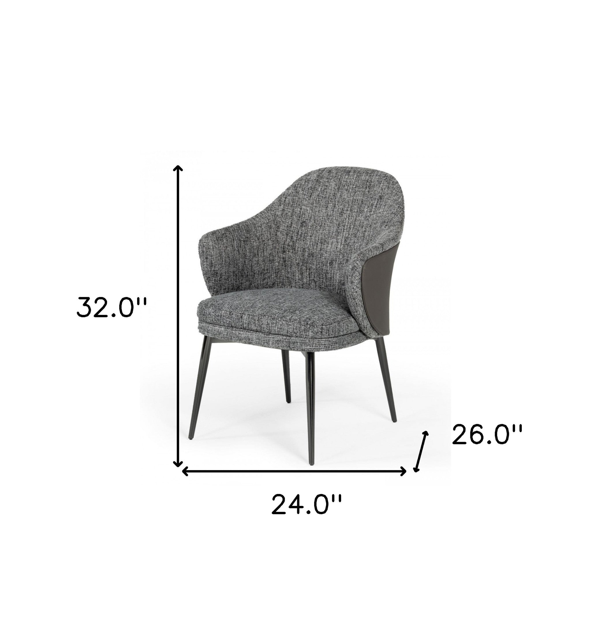 - Modern wingback armed dining chair with a mix of fabric and faux leather upholstery and metal legs.