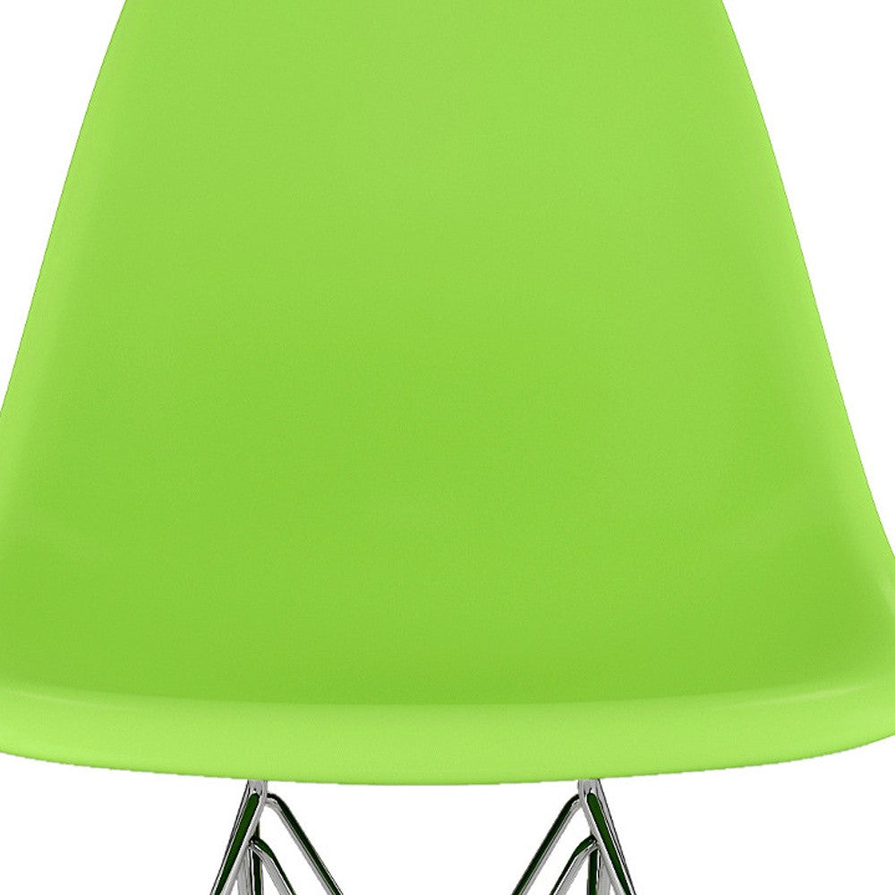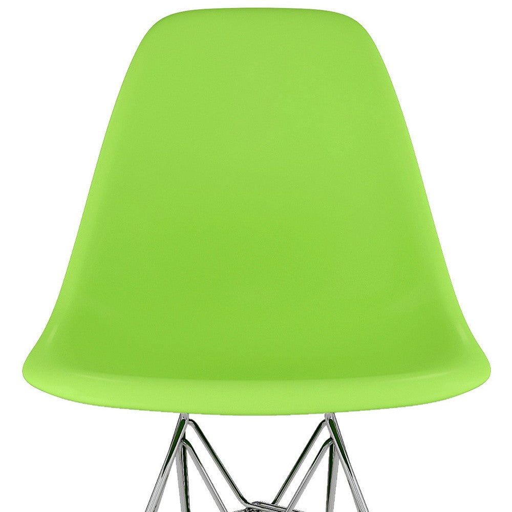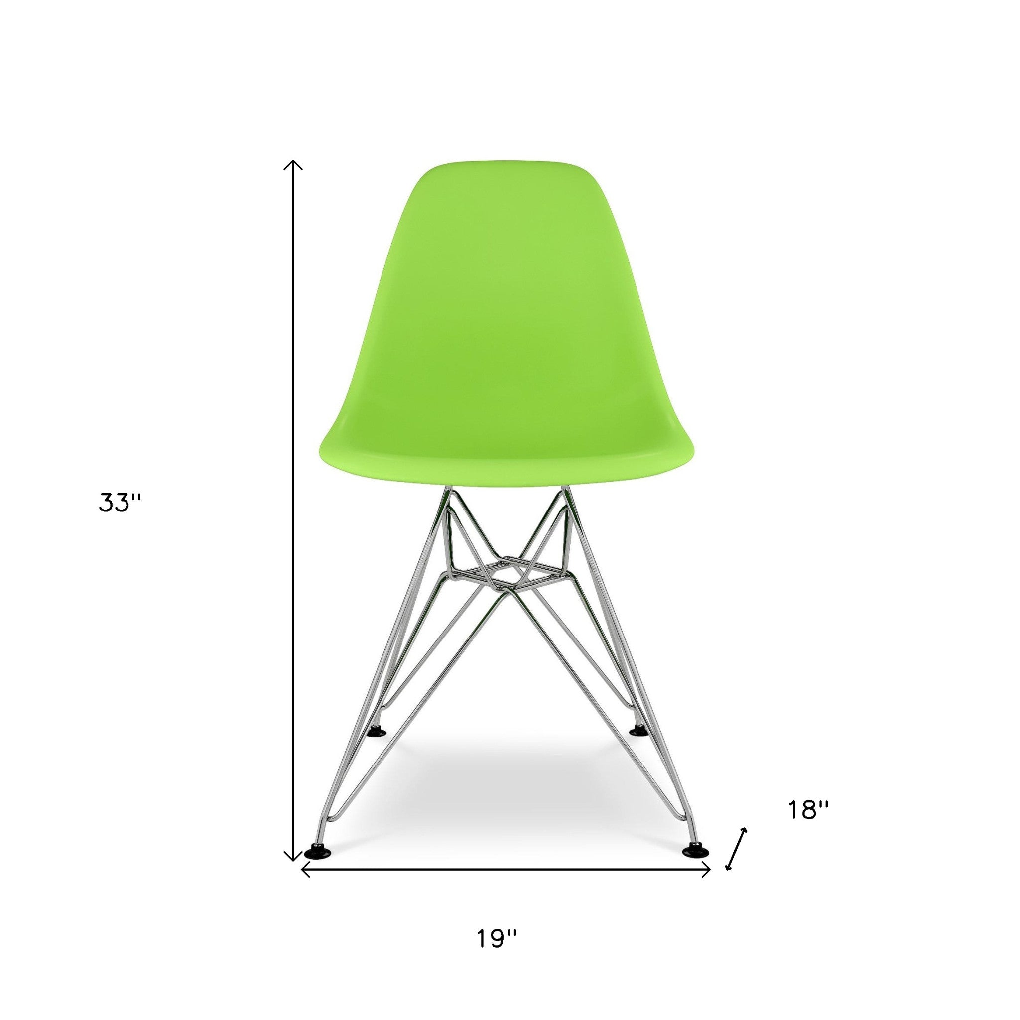 - Heavy duty matte finish plastic contoured seat dining chair with geometric chrome base legs.