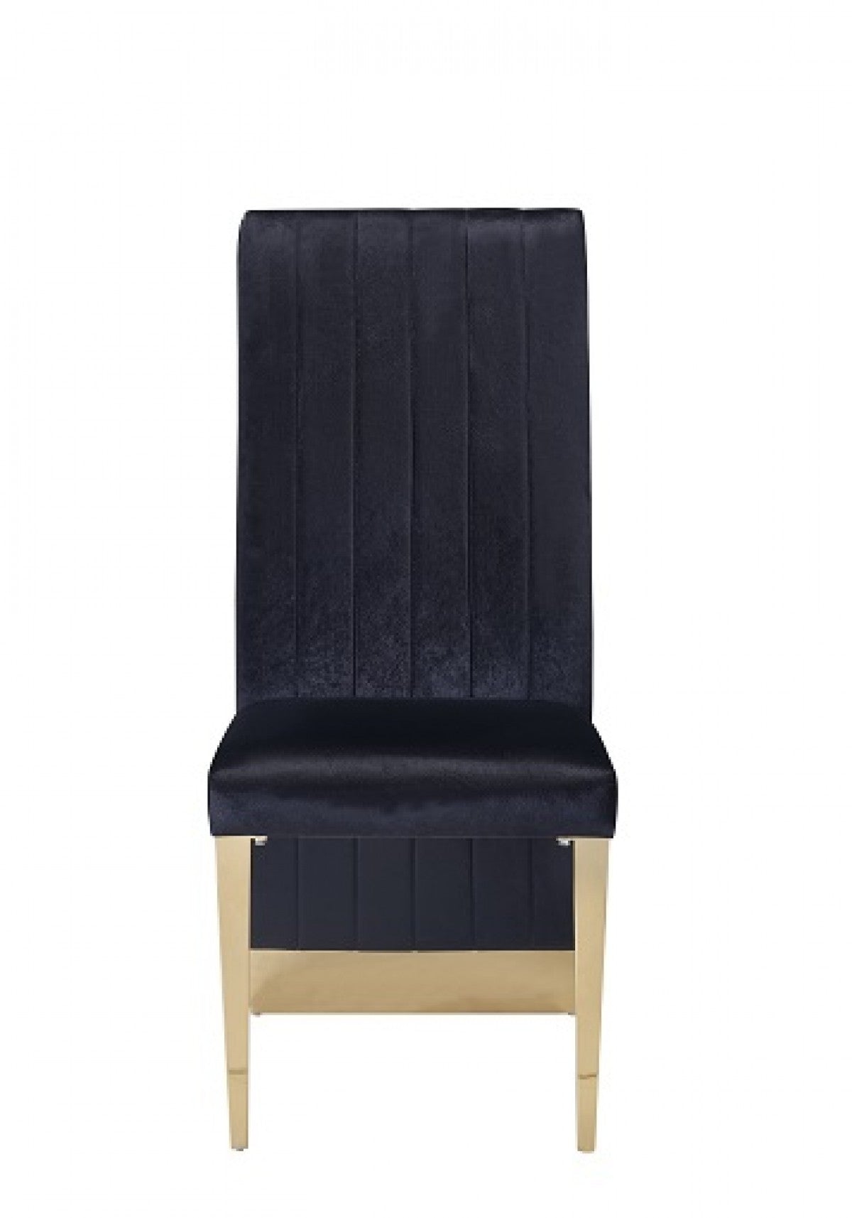 - Modern side dining chair with a sleek black and gold color scheme.