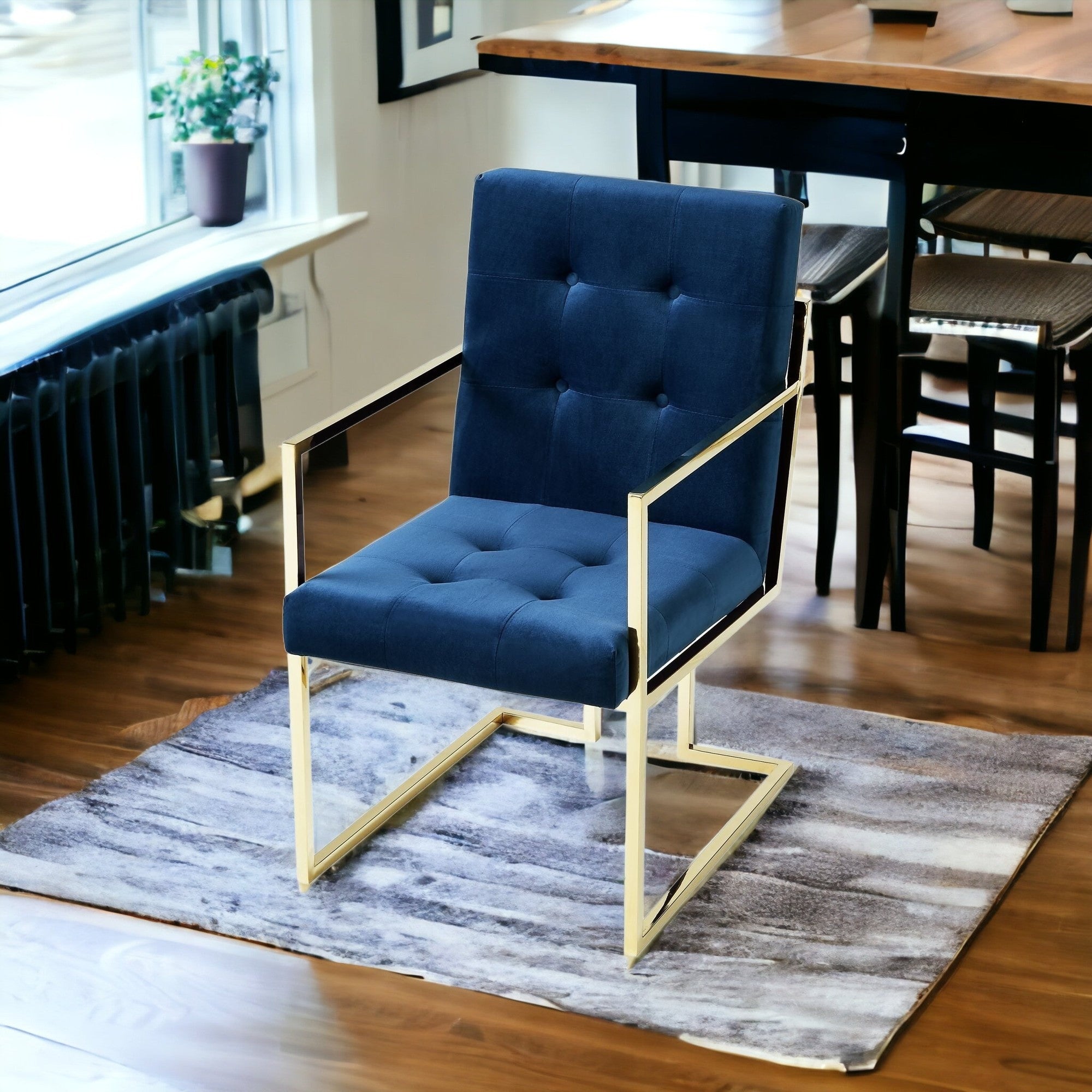 - Modern armchair with navy blue tufted upholstery and steel legs.